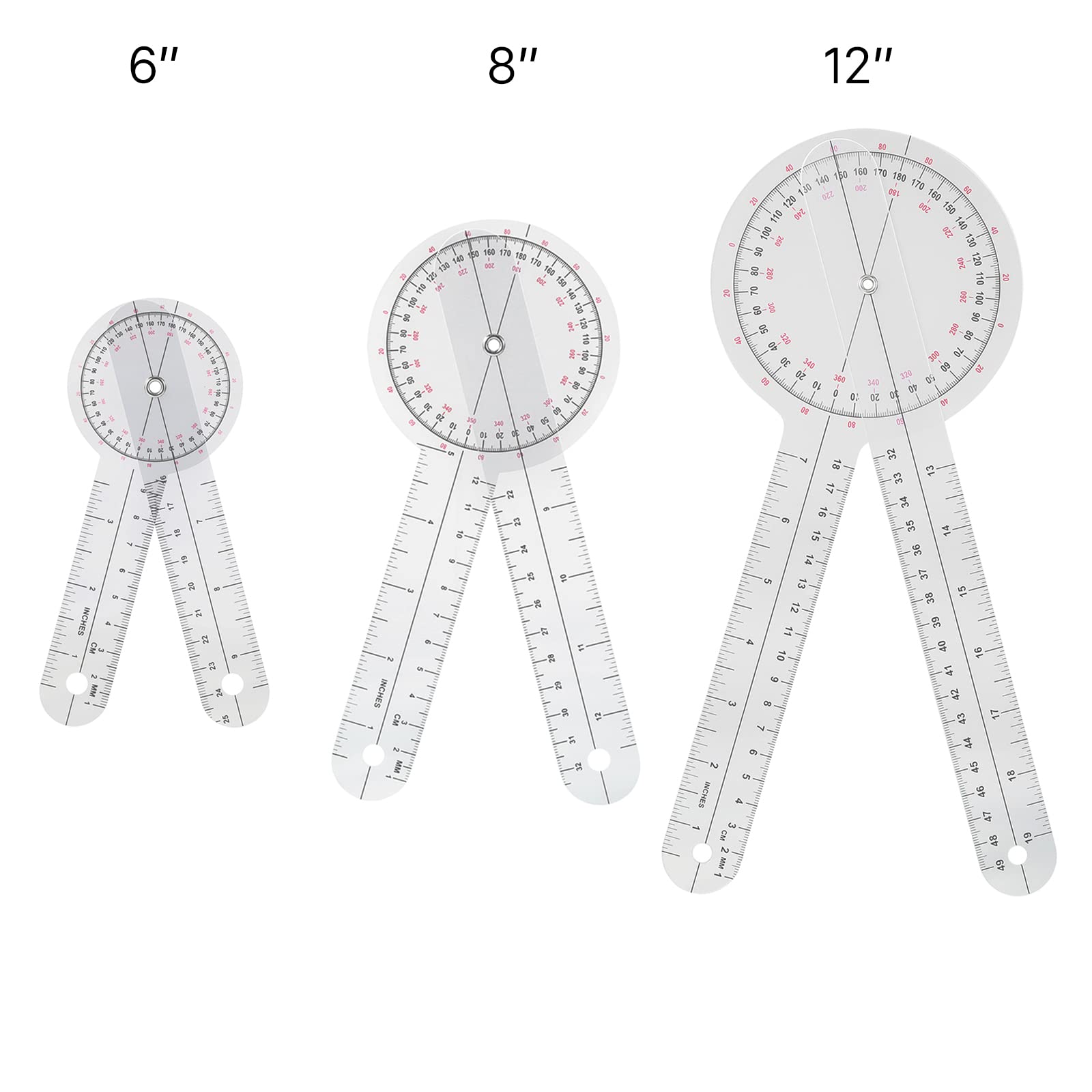 【Package Includes】You will get three different sizes of 360° goniometers: 12 inches, 8 inches and 6 inches, they can help us to assist physical therapy by determining the range of motion of a joint; a must-have therapy set for every home.