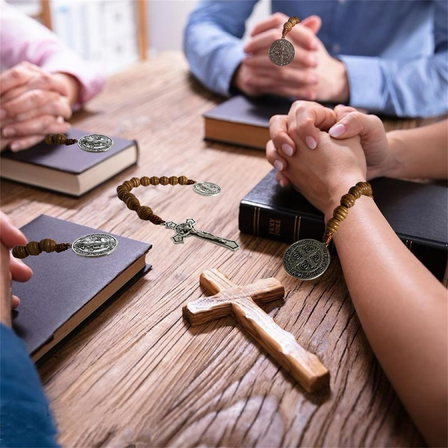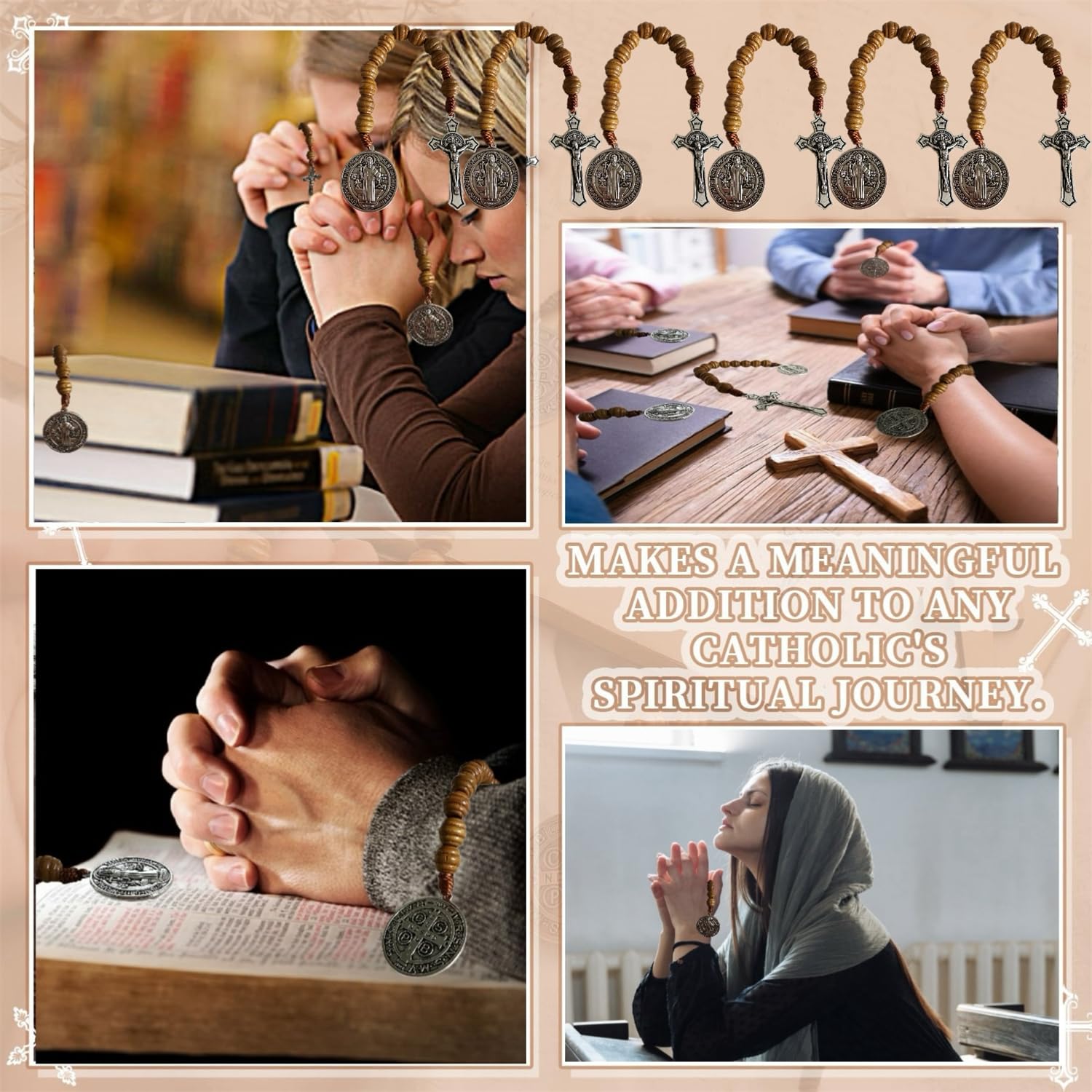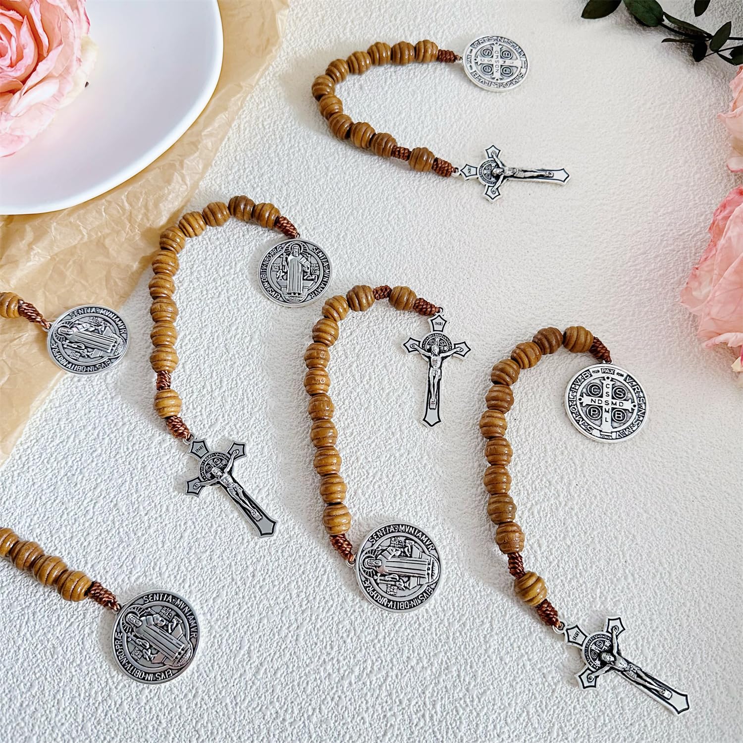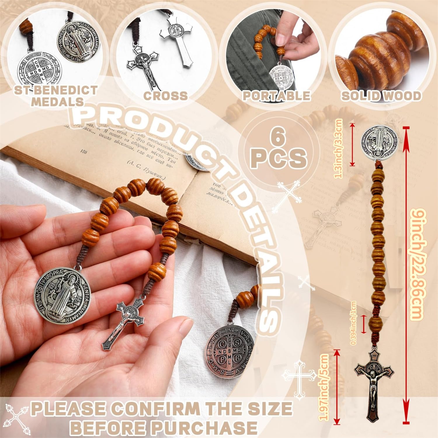 PACKAGE CONTENTS: Set of 6 Saint Benedict pocket rosaries featuring brown wooden beads, each measuring 9 inches in length with attached crucifix