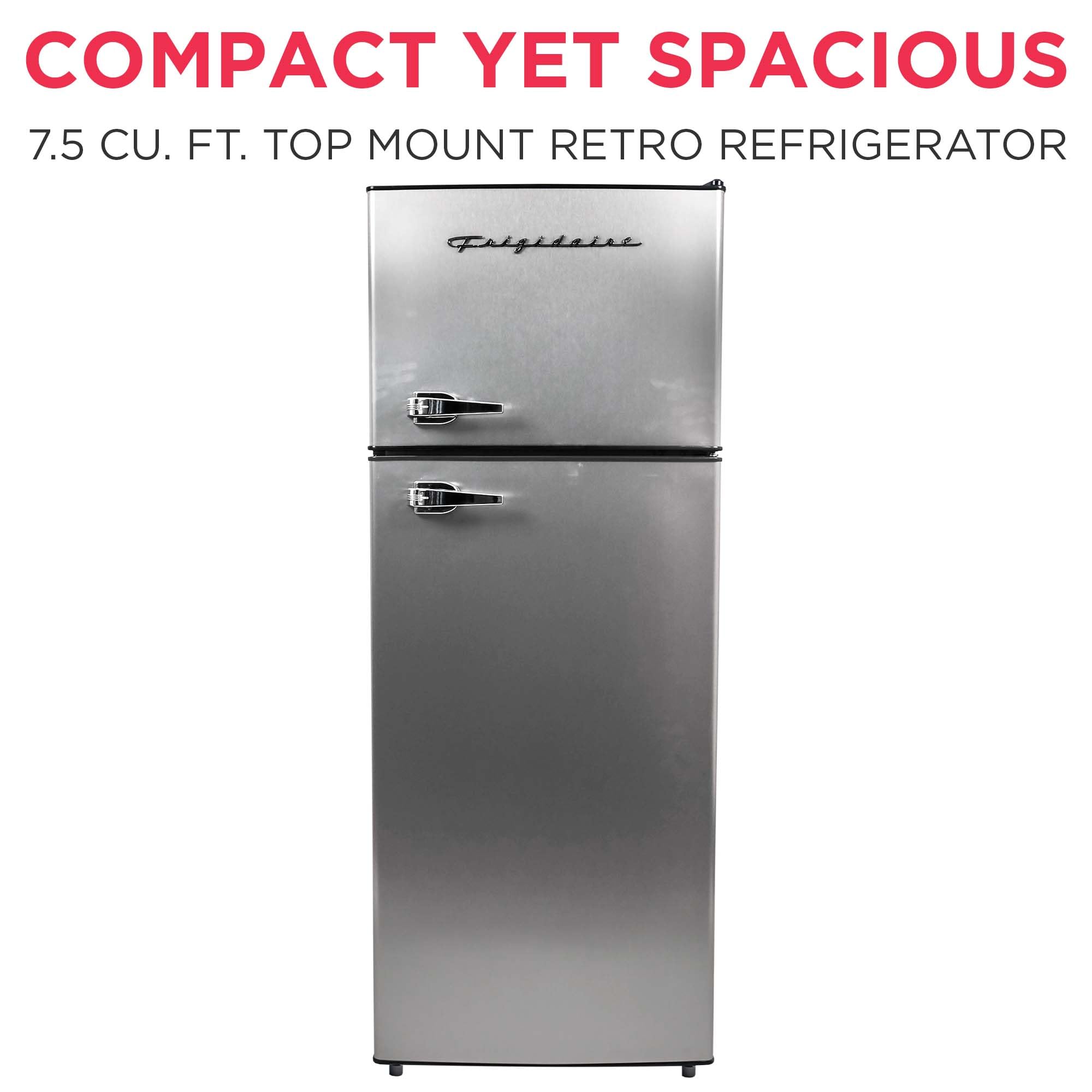 SLEEK DESIGN: Featuring a sleek and durable platinum design with chrome trim and handles, this small fridge freezer adds an upscale retro look that will elevate your space.
