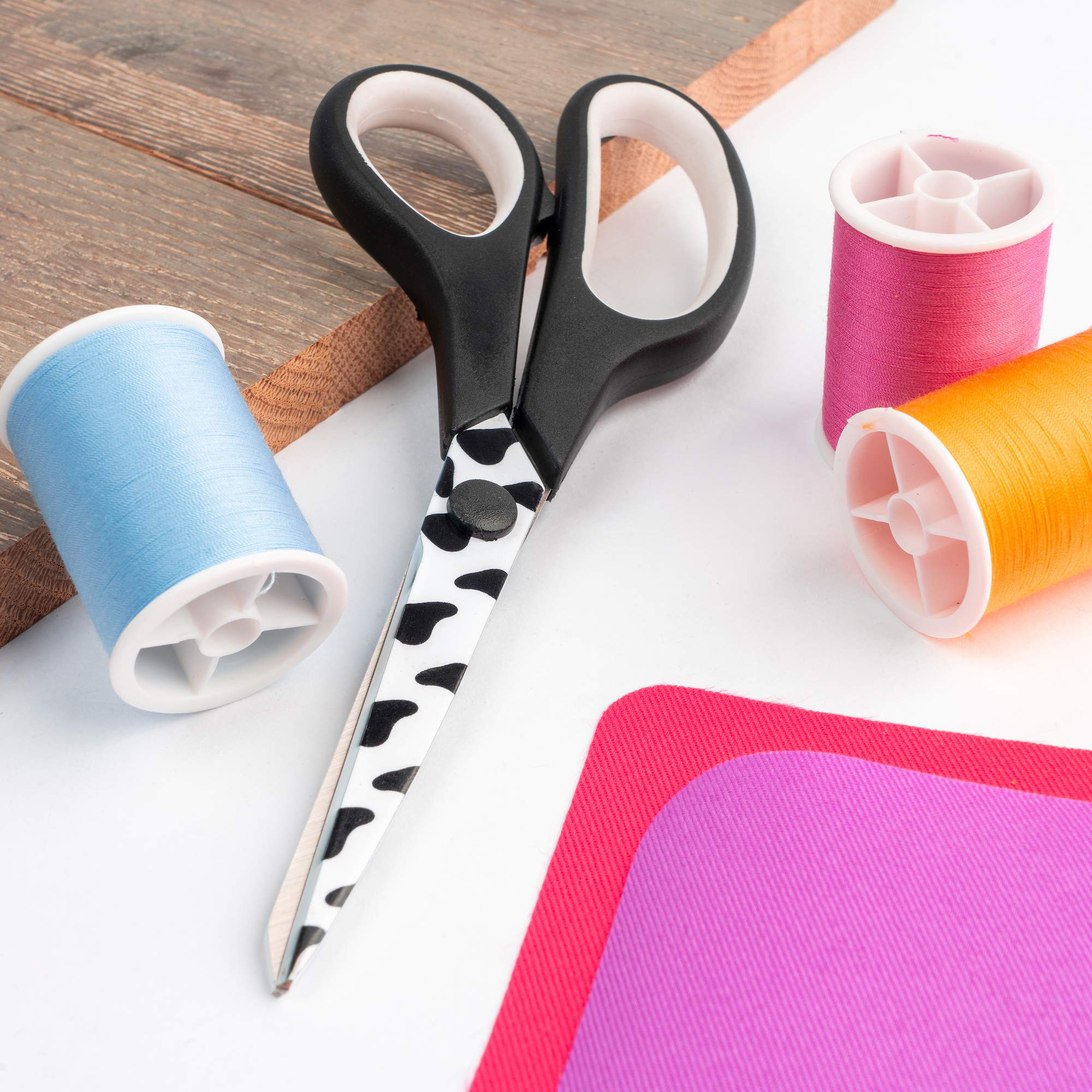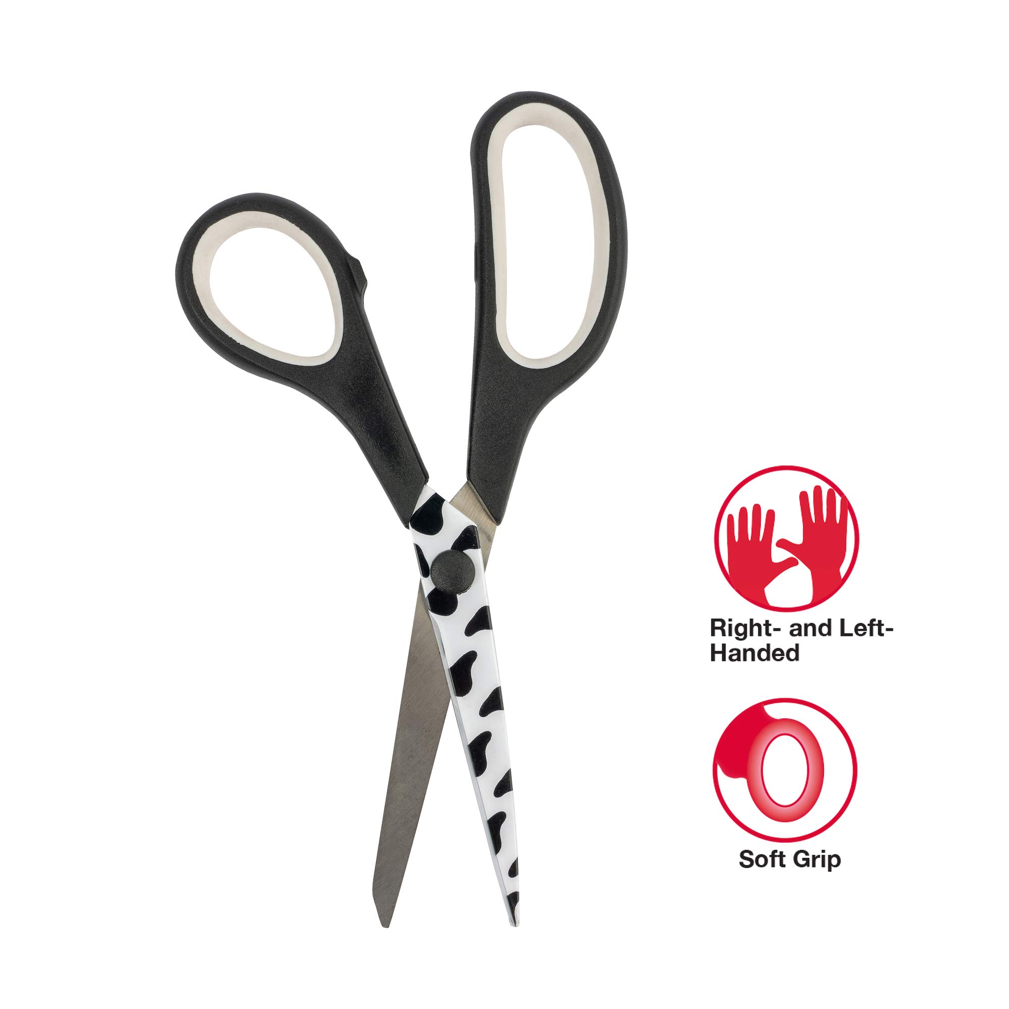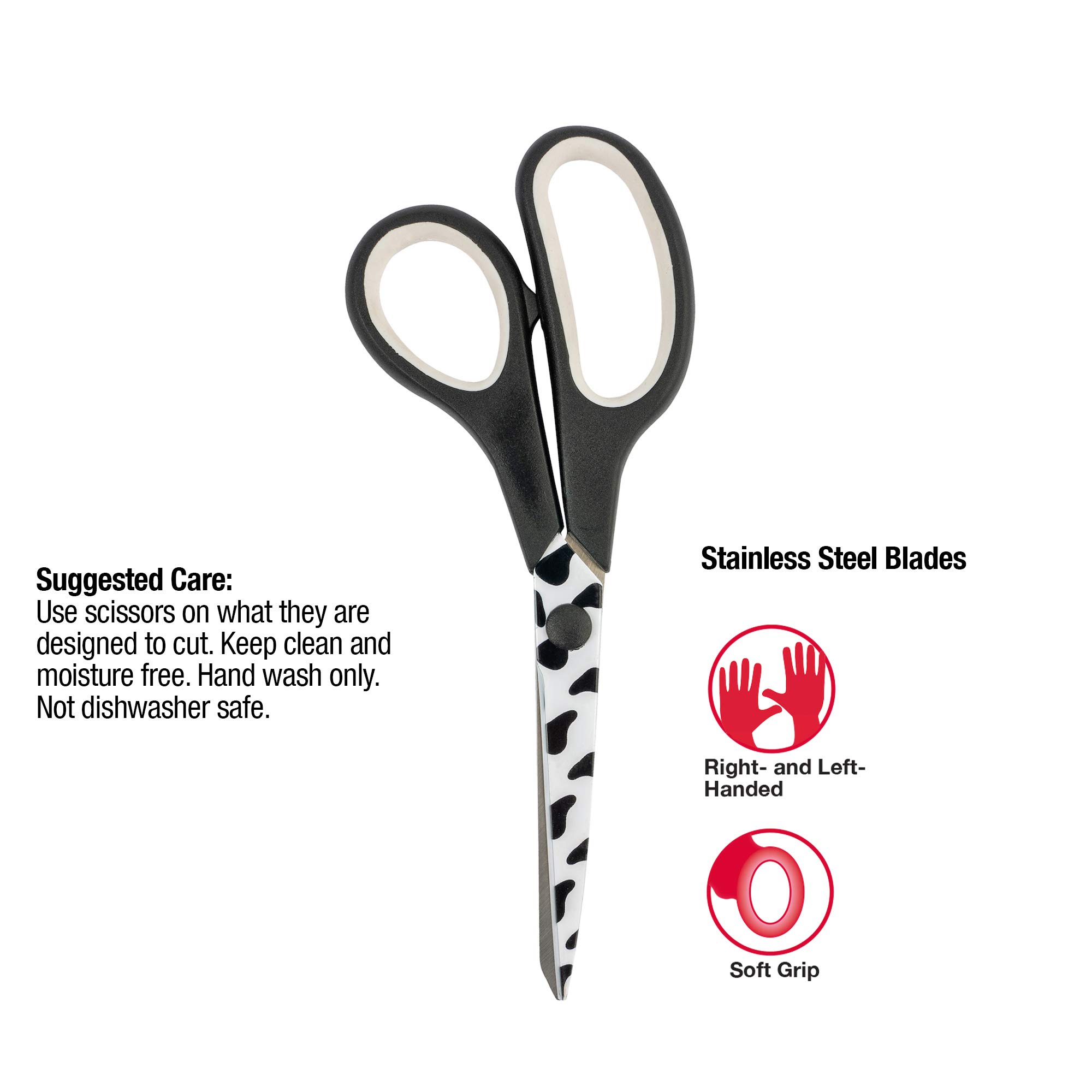 SINGER All-Purpose Scissors are the perfect cutting tool for simple sewing and mending projects, but they can also be used for a variety of everyday cutting tasks from the home office to the arts and crafts room. Measuring 7.75 inches in length, these versatile, multi-use scissors can be handled by both right-handed and left-handed adult users. They feature sharp, stainless steel blades for easy cutting of fabrics, paper, felt, poster board, and more. The blades are printed with a whimsical black and white cowhide design. The soft, rubberized handle provides a comfortable grip, and the handle’s modern black and white color scheme matches the blades’ fun cowhide print. Warning: Not to be used in contact with food. This product has sharp blades. Keep away from children. Not dishwasher safe. Hand wash only. For best performance, keep scissors clean and moisture free. "