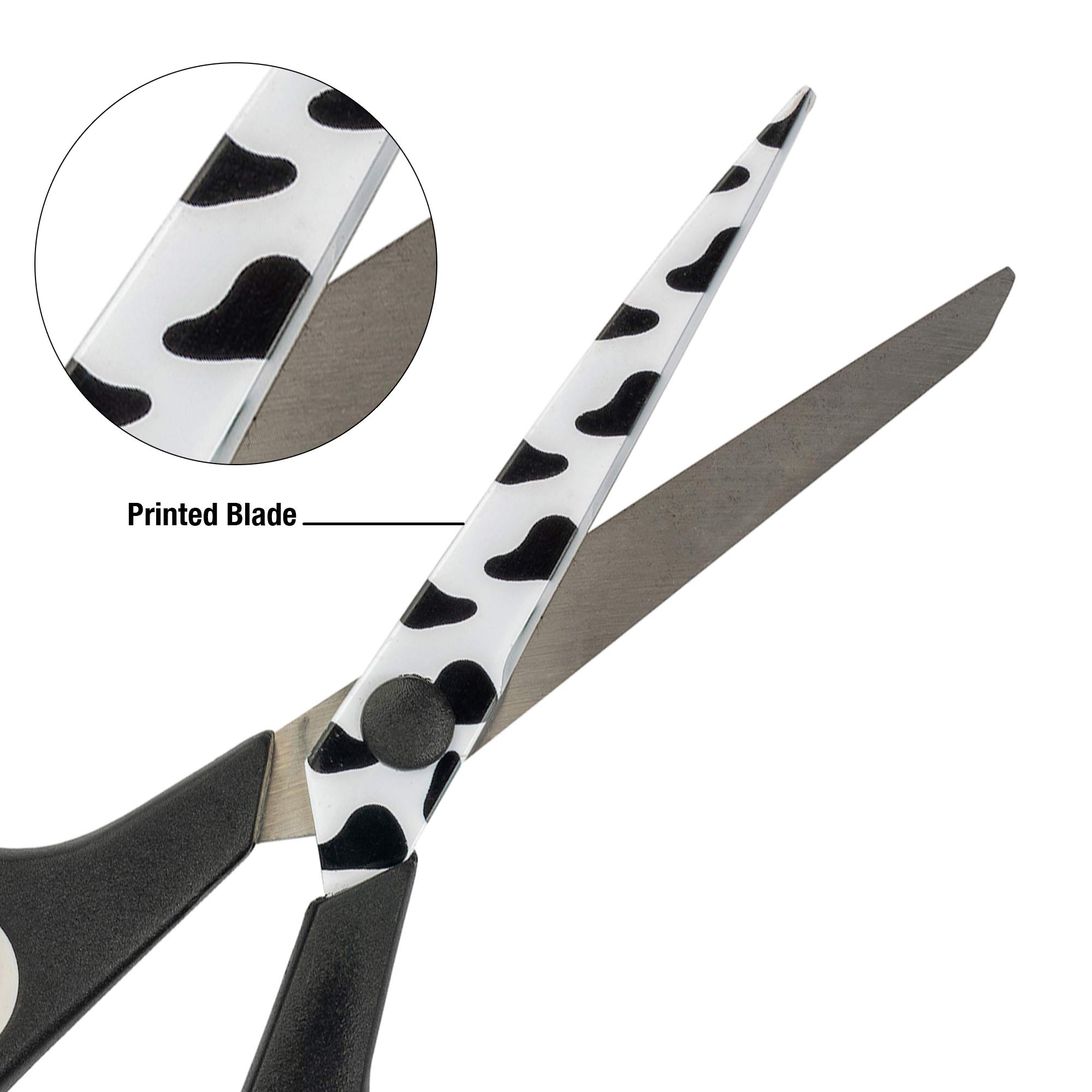 Blades are printed with a fun black and white cowhide design, with a matching solid black handle