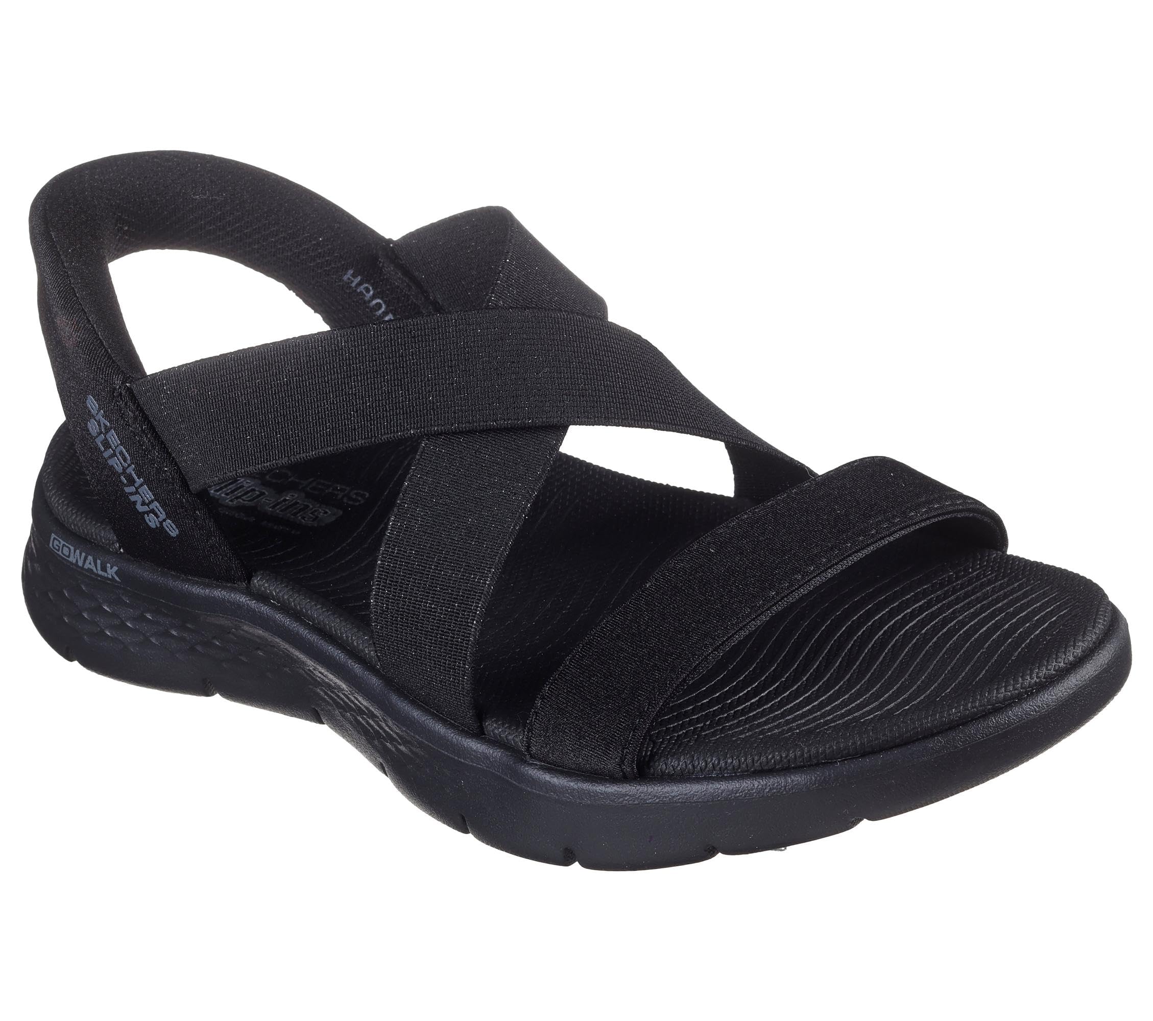 Description Step into comfort with these Skechers GO WALK Flex Sandals designed specifically for women. These womens sandals feature shimmery gore straps and innovative comfort technology, making them perfect for all-day wear. The strappy design combines athletic performance with casual style, featuring a contoured Goga Mat comfort footbed and lightweight ULTRA GO cushioning. These sandals for women offer the perfect blend of style and functionality, with a secure heel pillow and durable traction outsole for enhanced stability.