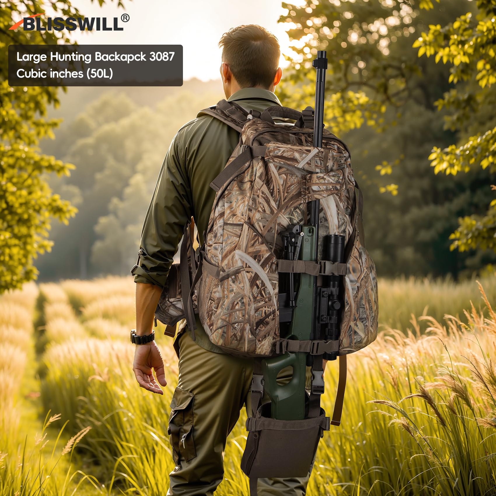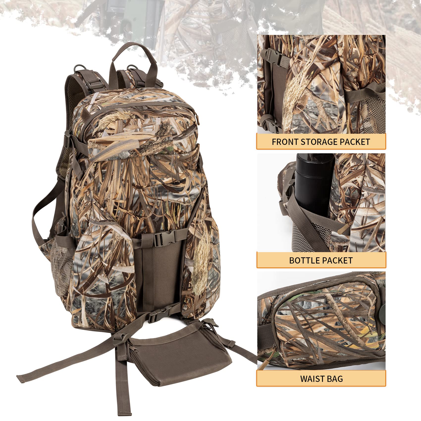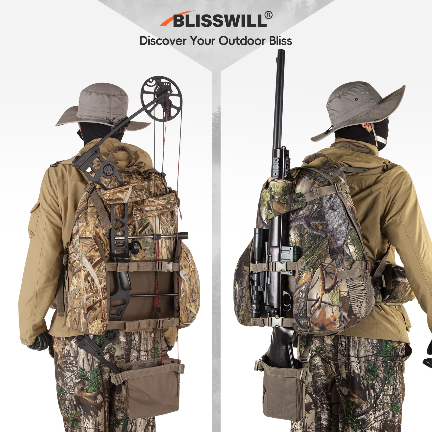 Hunting Conducive:BLISSWILL hunting Backpack made of waterproof premium soundless fabric,to give hunters quick, quiet access to gear.precise stitching,lightweight and durable.Camo pattern:maximum camouflage during hunting.Size:20.9*14.7*10inch.Weight:1.4kg.