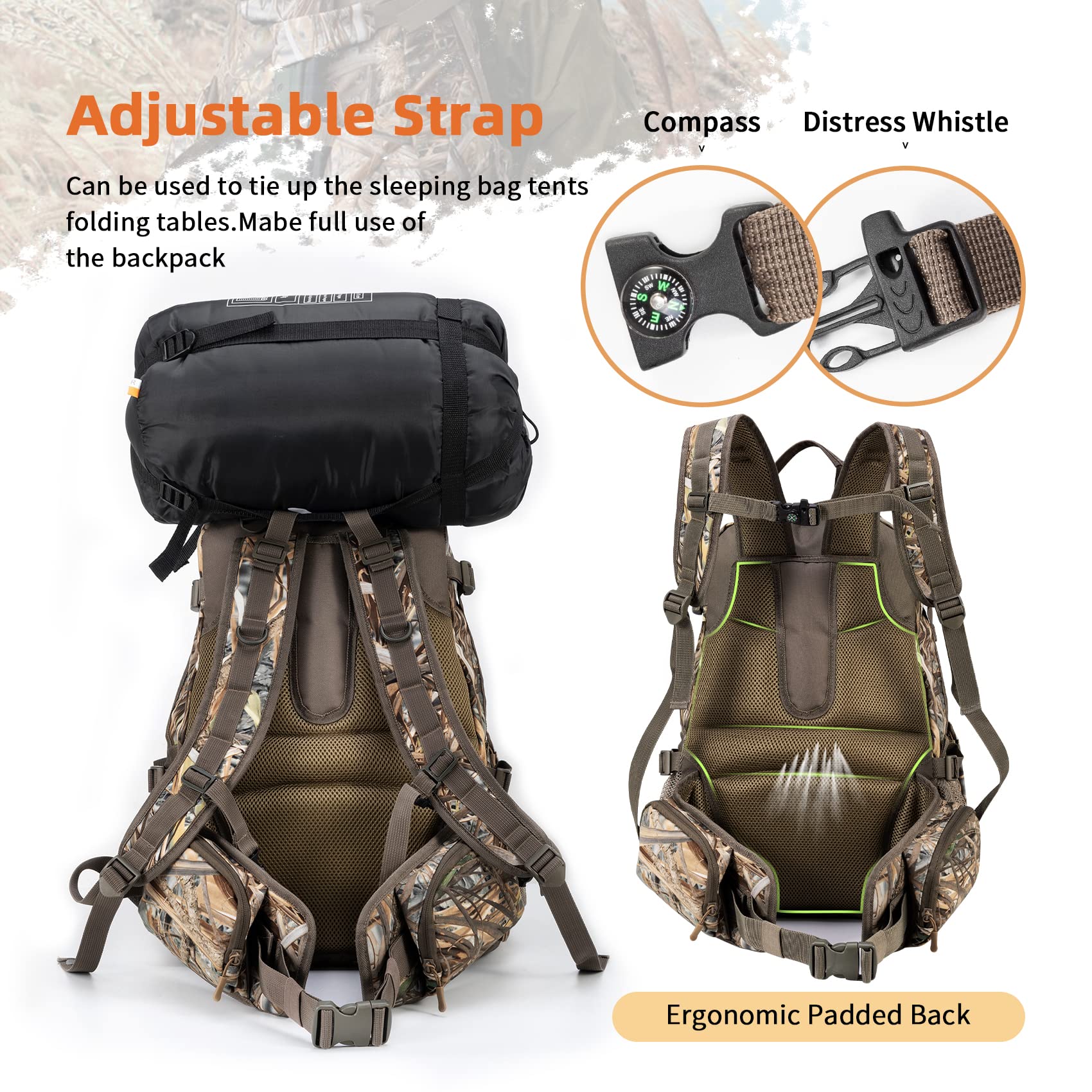 Ergonomic Design:Expandable pocket to carry your gun or compound bow securely, and an adjustable torso system, you can comfortably carry your hunting essentials, padded shoulder straps, a padded cool mesh back, an adjustable sternum strap and a waist belt,decompressed,breathable and comfortable