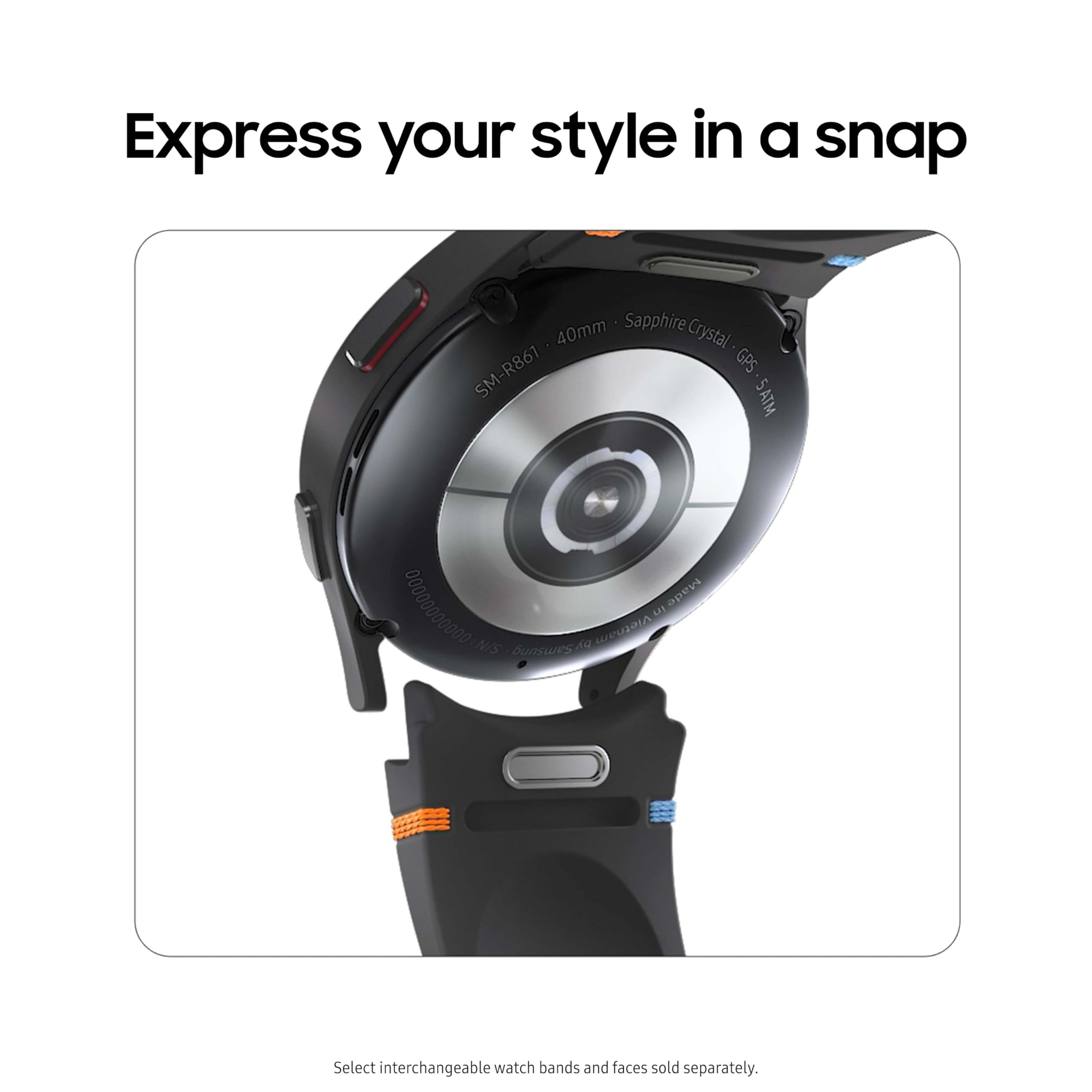 ¹Requires compatible smartphone. ²The Samsung BIA is a body analyzer that uses bioelectrical impedance analysis (BIA) technology to track body composition based on weight, body fat, body mass index (BMI), skeletal muscle, body water and basal metabolic rate (BMR) measurements. It is not intended to specifically diagnose or treat a medical condition. ³Galaxy AI features track data and require compatible Samsung Galaxy phone, Samsung Health app and Samsung Account. Available only for running workouts. Requires initial setup of 10 minutes of outside running with GPS on compatible smartphone and Samsung Health app version 6.22 or later. The heart rate software functions are not intended for use in the diagnosis of disease or other conditions, or in the cure, mitigation, treatment or prevention of disease. ⁴The ECG app is not intended for users with known arrhythmias other than atrial fibrillation or users under 22 years old. Users should not interpret or take clinical action based on the device output without consultation of a qualified healthcare professional. The ECG app is not intended to replace traditional methods of diagnosis or treatment. Requires compatible Samsung smartphone. ⁵Galaxy AI features track data and require compatible Samsung Galaxy phone, Samsung Health app and Samsung Account. Phone must be within 2 feet of user with snore detection enabled through Samsung Health app version 6.22 or later. ⁶Phone must be within 2 feet of user with snore detection enabled through Samsung Health app version 6.22 or later. ⁷Requires compatible smartphone and Galaxy Buds. ⁸Select interchangeable watch bands and faces sold separately. ⁹Consistent with IP68 rating, water resistant in up to 5 feet of water for up to 30 minutes. Rinse residue / dry after wet.