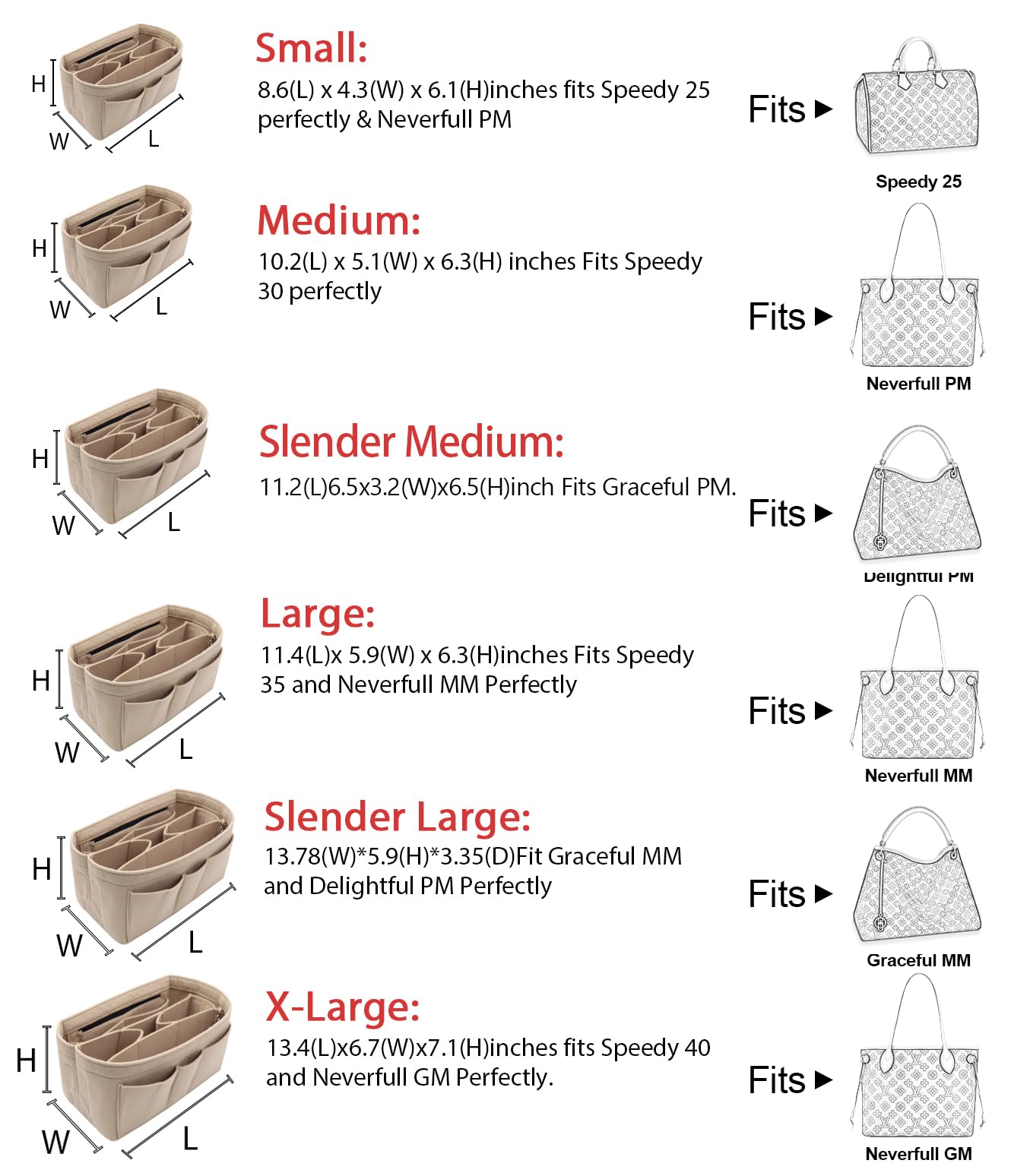 Small:8.6(L) x 4.3(W) x 6.1(H)inches fits LV Speedy 25 perfectly & LV Neverful PM ; Medium: 10.2(L) x 5.1(W) x 6.3(H) inches Fits Speedy 30 perfectly; Large: 11.4(L)x 5.9(W) x 6.3(H)inches Fits LV Speedy 35 and LV Neverful MM Perfectly.X-Large:13.4(L) x6.7(W)x7.1(H)inches fits LV Speedy 40 and LV Neverful GM Perfectly.Portable and Compact Purse Perfectly For any Brand, Such As LV, Longchamp Le Pliage Tote, MK, LV Petit Noe, Gucci, etc.