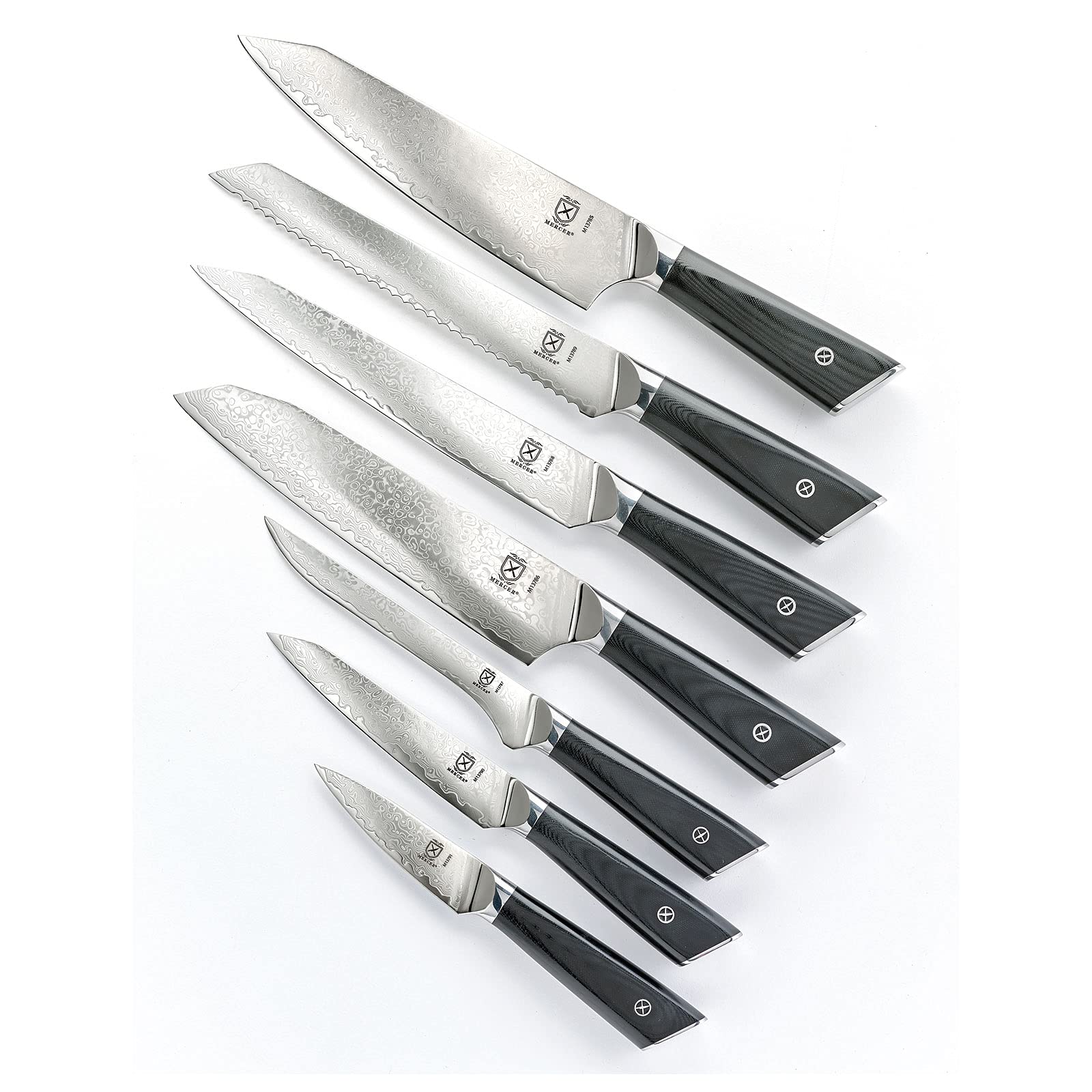 Set includes: 8-Inch Chef, 8-Inch Bread, 6-Inch Boning, 5-Inch Utility, 3.5-Inch Paring, 7-Inch Santoku, 8-Inch Slicing Knives and Magnetic Stand. Beautiful Damascus styling clad stainless steel that protects core while maintaining a sharp 15-degree edge. Razor sharp with Rockwell Hardness of 62. Premium ergonomic G10 handle for durability and stability. The shape offers superior hand control and comfort. 1% Carbon, 15% Chromium, 1% Molybdenum, 0.2% Vanadium, and 1.5% Cobalt. Wash by hand and dry with a clean towel after use. Limited Lifetime Warranty.