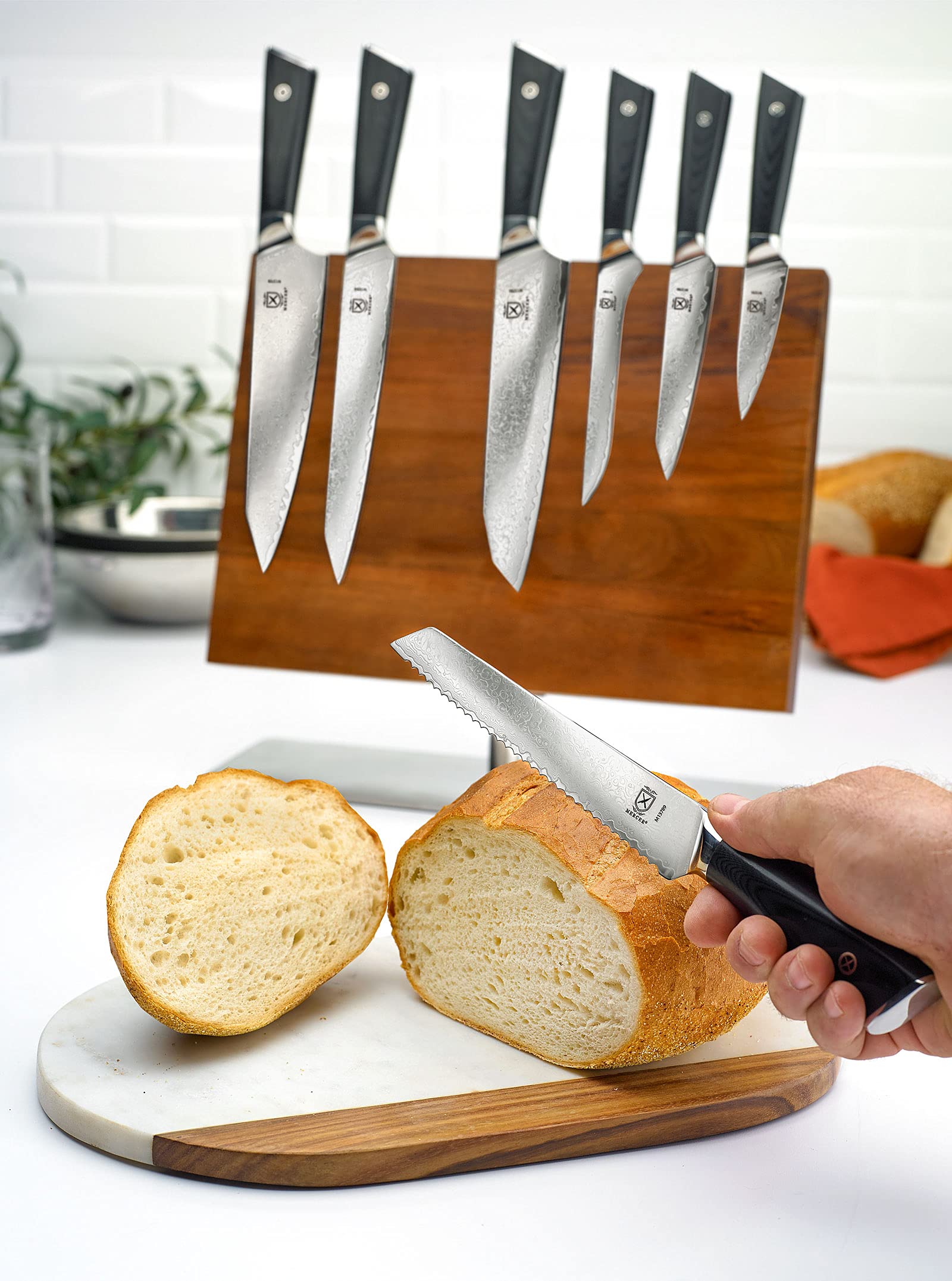 KITCHEN KNIFE SET INCLUDES: 8" Chef's Knife, 8" Bread Knife, 6" Boning Knife, 5" Utility Knife, 3.5" Paring Knife, 7" Santoku Knife, 8" Slicer, Magnetic Acacia Wood Board on Stand
