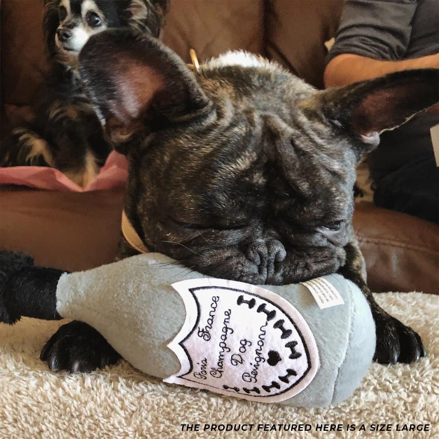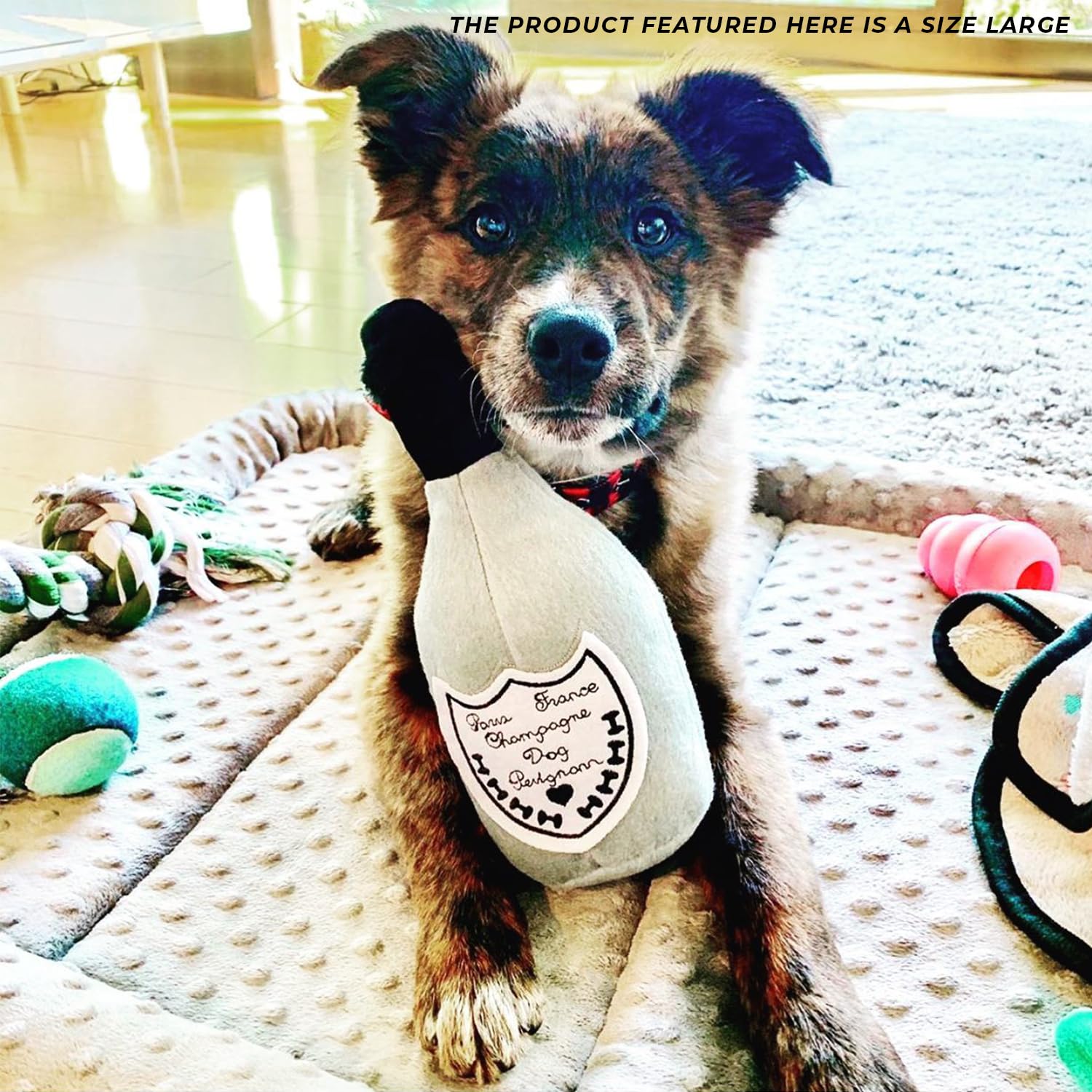 Funny Parody Plush Dog Toy: For your pampered pooch’s consideration—our finest bottle of Dog Perignonn Champagne! It features a velvety soft exterior and exquisitely embroidered details that’s sure to uncork the fun.