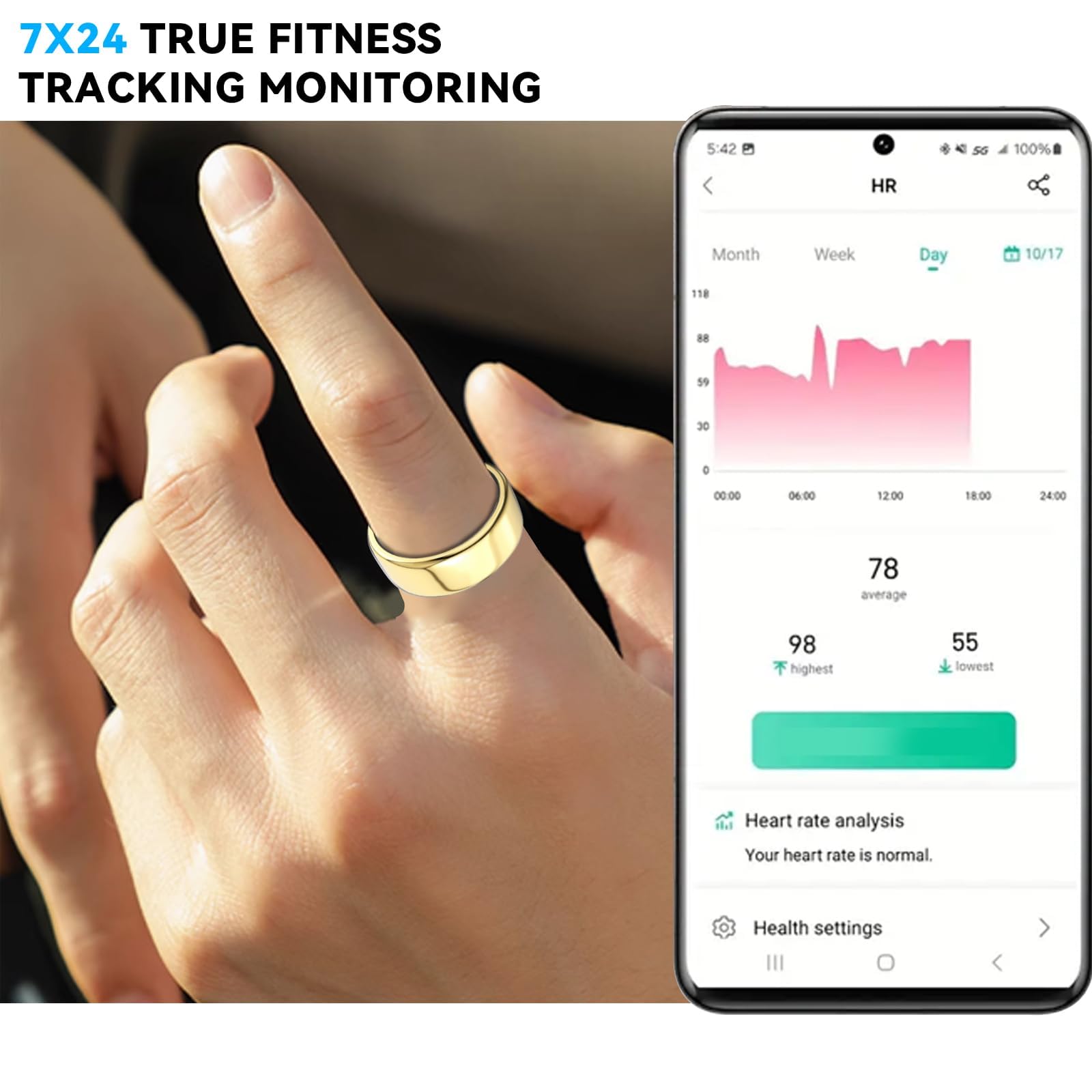 【Track Your Health】Hivisuals smart ring can get your health through your finger. This health ring is designed to provide women and men with a 24-hour heart rate, 24-hour blood oxygen and daily step counts. Besides,you can conveniently view these real-time health metrics from your finger anytime. Also you can checkdaily, weekly and monthly health data in non-subscription app