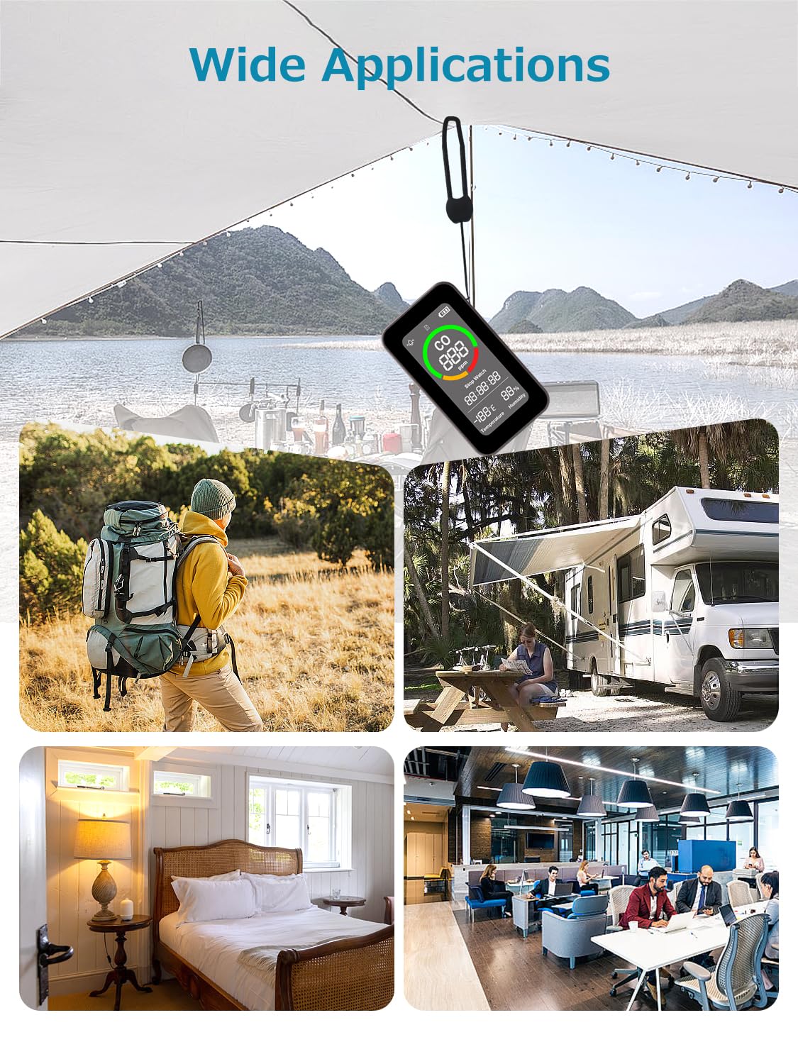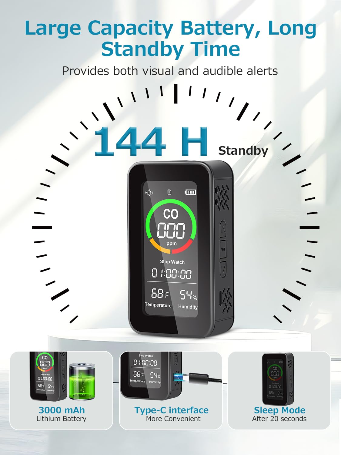 【Built in 3000mAh Large Capacity Battery】 This small carbon monoxide monitor is equipped with a 3000mAh battery, can standby for up to 148 hours, and supports Type-C charging. This travel CO Monitor can help you detect gas and air pollution in homes, offices, schools, cars, hotels, travel, camping, parties and other places, prevent carbon monoxide poisoning, and protect you and your family in a healthy air environment.