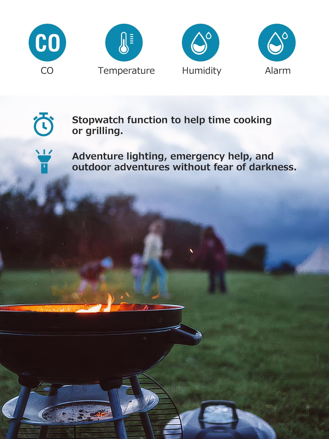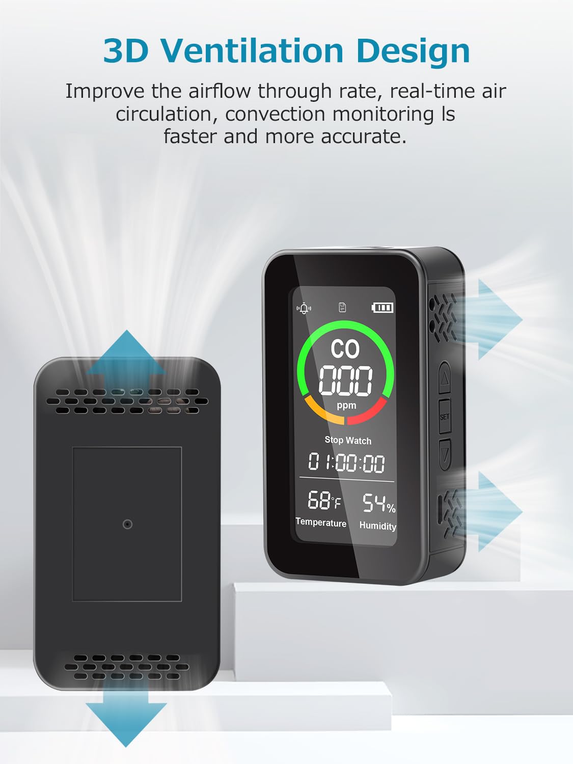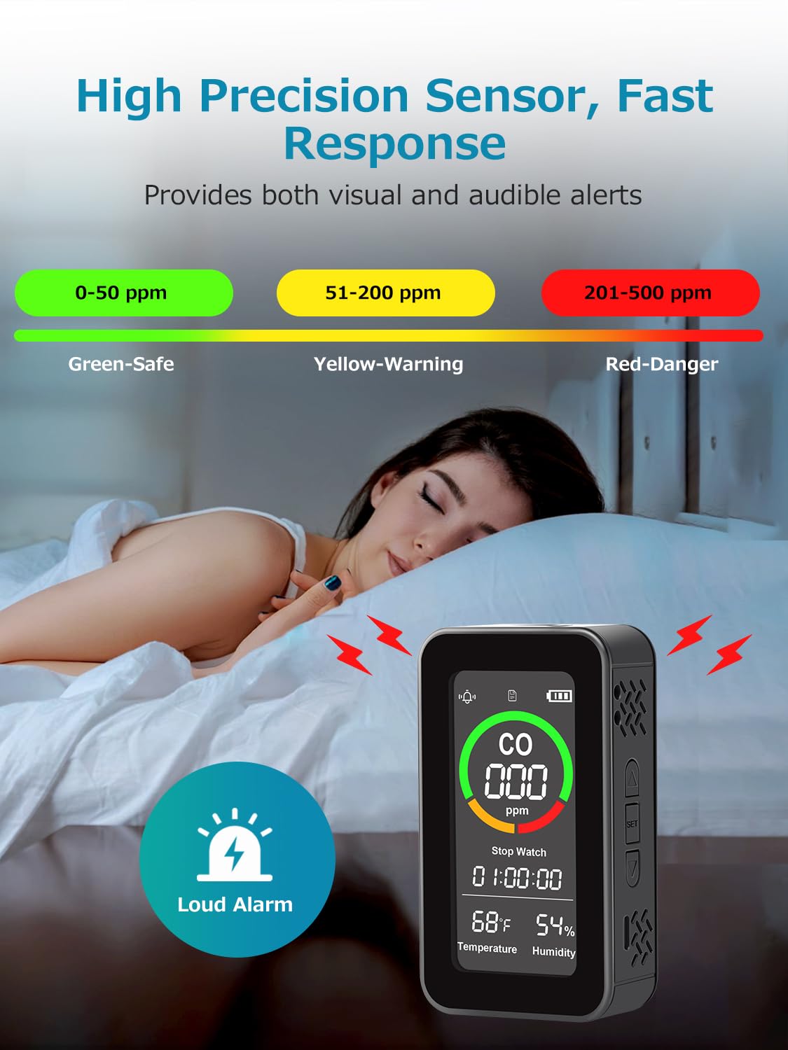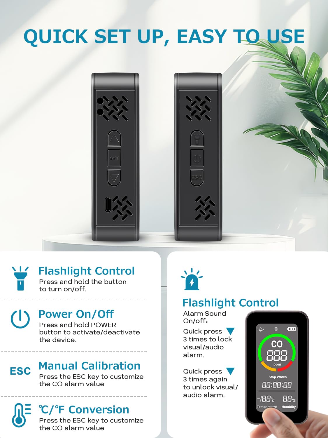 【Lighting and Timing Design】Portable travel carbon monoxide detector with built-in strong flashlight and timing function. Emergency lighting helps prevent you from getting lost while traveling; the timer allows you to plan your time scientifically and precisely control the time when cooking in the kitchen.