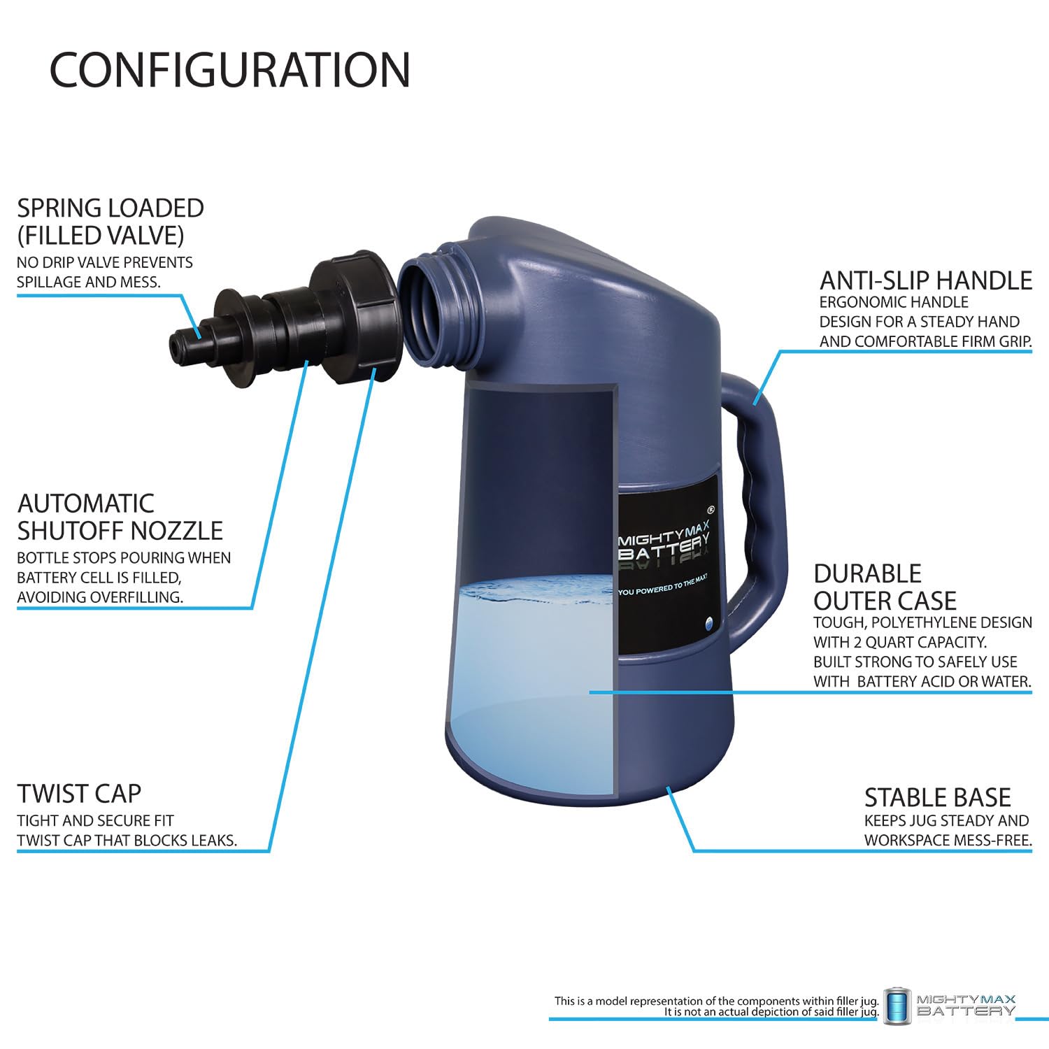 Safe - This 2 quart capacity battery filler is tough made with polyethylene, safe to use with battery acid. Stops surface discharge caused by wet battery.