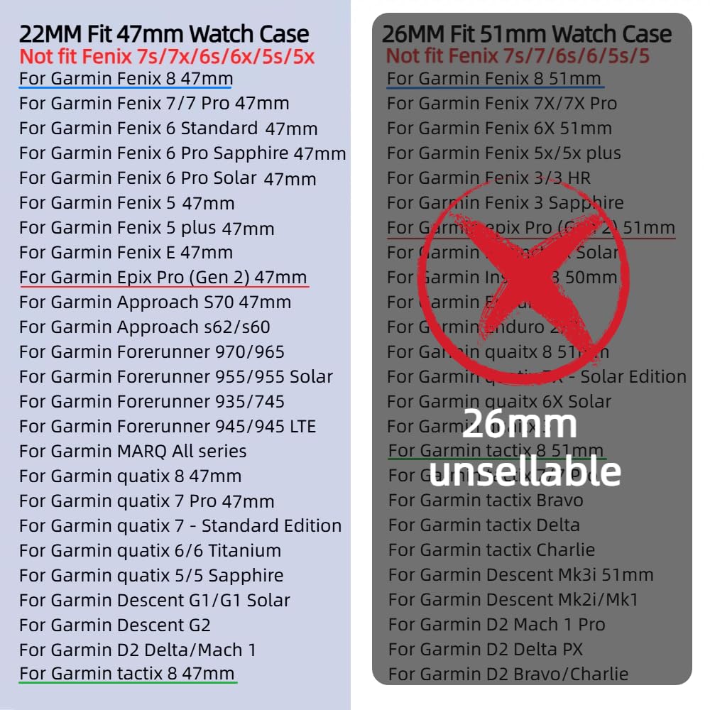 【22mm Watch Bands Compatible with Garmin 47mm Watch Case】Fits for Garmin Fenix 8 (AMOLED/SOLAR) 47mm, Fenix 7/6/5 series (47mm), Epix Gen 1 & 2 (47mm), Forerunner 965/955/945/935/970, Approach S60/S62/S70, MARQ, Quatix 5/6/7, and Fenix E 47mm models. For Forerunner watches, please reuse the original spring bars when installing this Quick-Fit 22mm nylon band.