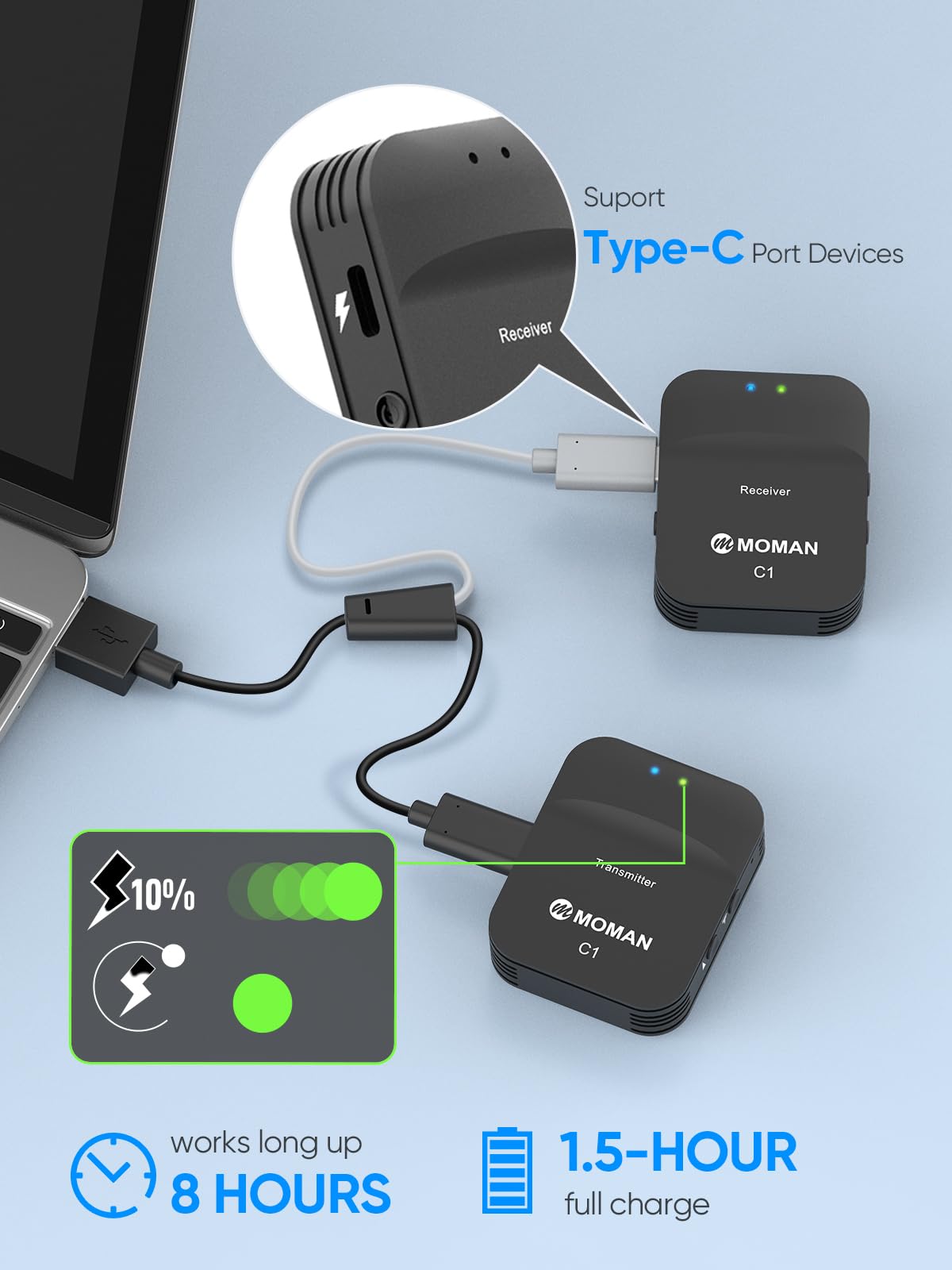 8-Hour Battery Life& Light Indicators: With built-in 400mAh lithium battery, Moman wireless miclavalier microphone delivers up to 8 hours of usage on a full 1.5-hour charge; You can even charge it while recording; The indicator lights on transmitter and receiver provide working status like Power, Charging, Pairing, and Noise Cancellation