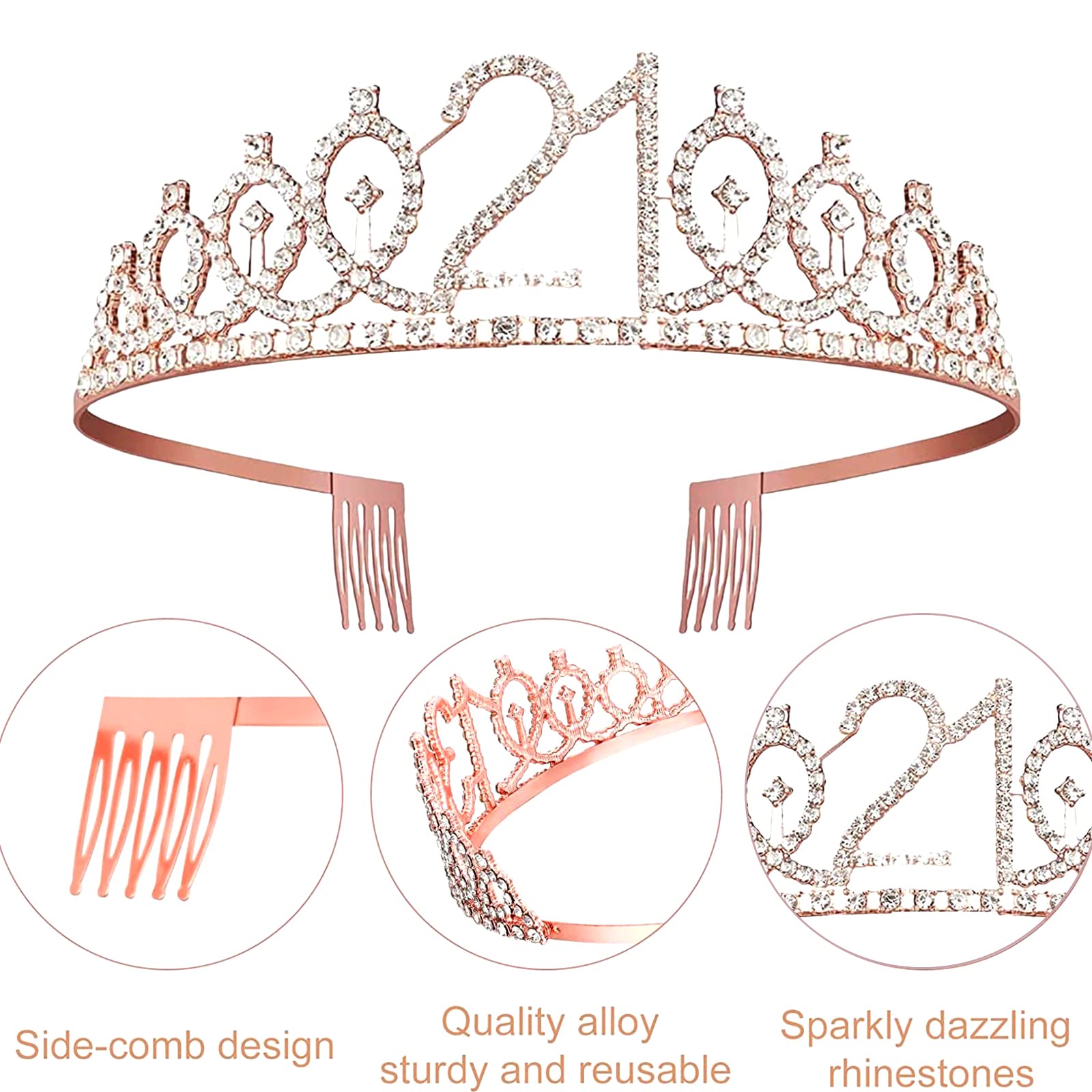 【21 Birthday Tiara】: The 21st birthday crown headband is made of quality alloy and shiny rhinestones, rose gold color highlights elegance. Crown with combs that make sure it can grip the hair more tightly for fitting girls.