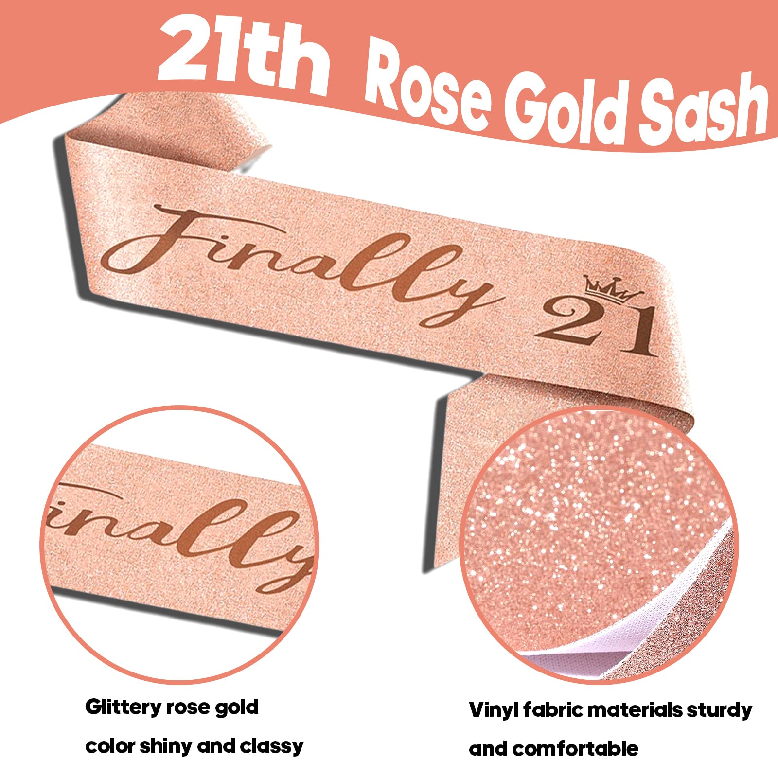 【Finally 21 Birthday Sash】: 21 sash for birthdays made from soft glitter fabric using hot-pressed stamping foil will compliment any outfit and be durable enough to last day into night. The sash is 63” (160cm) long and is adjustable with pearl pins to fit all body types.
