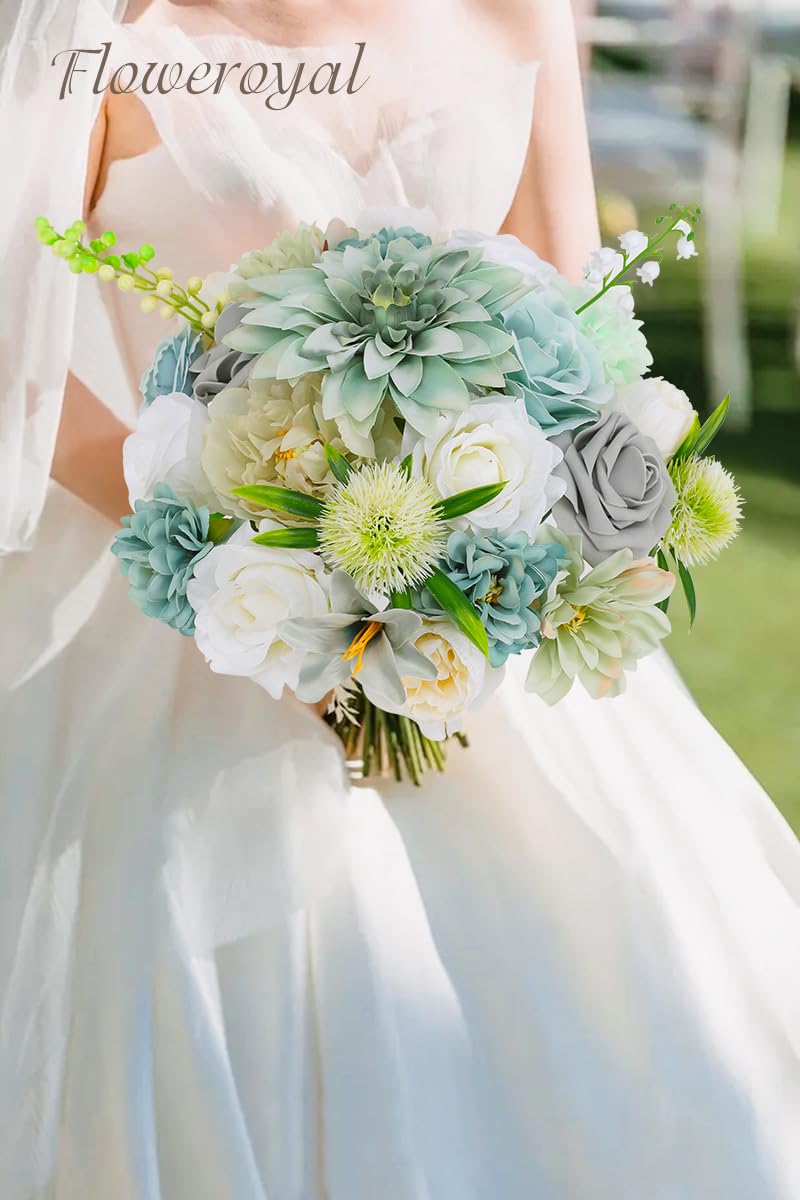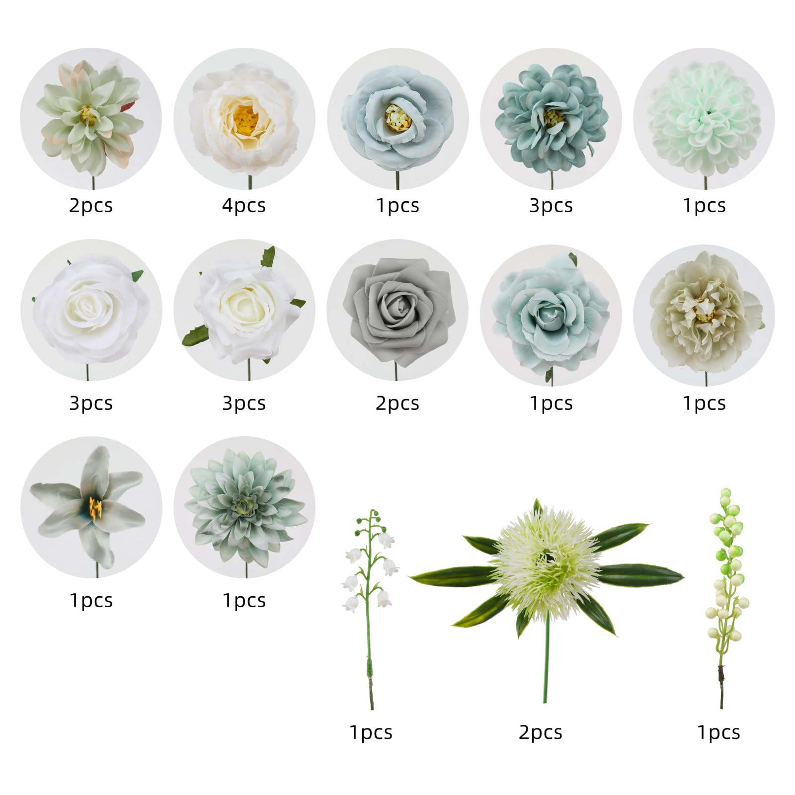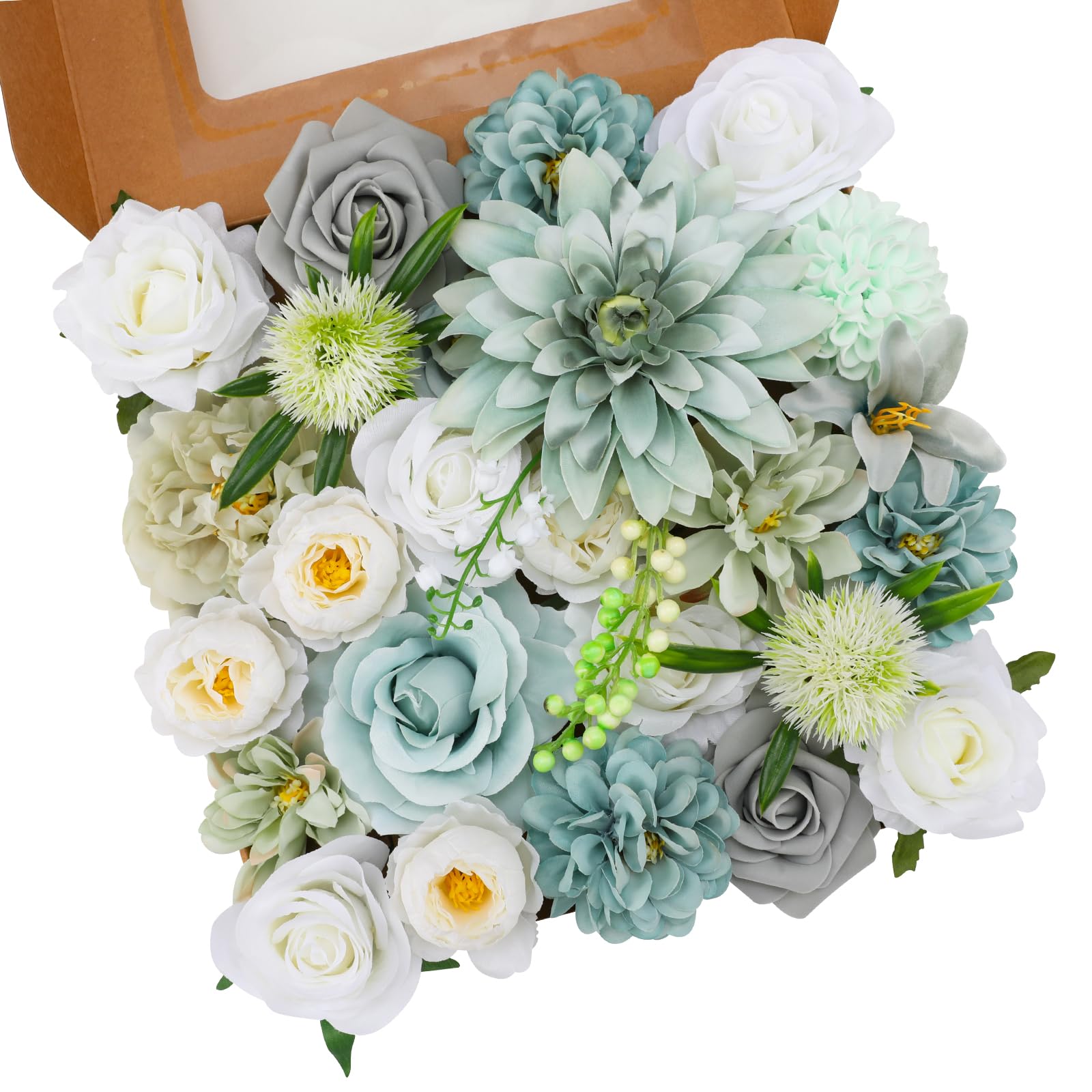 ♔TEAL BLUE ARTIFICIAL FLOWERS COMBO-Floweroyal faux flower set contains roses, dahlias, peonies,chrysanthemum, wild flowers and other accessories. All comes in a very cute box, easy giftable item.