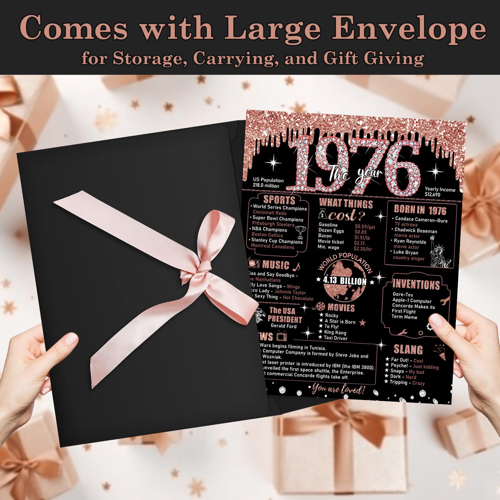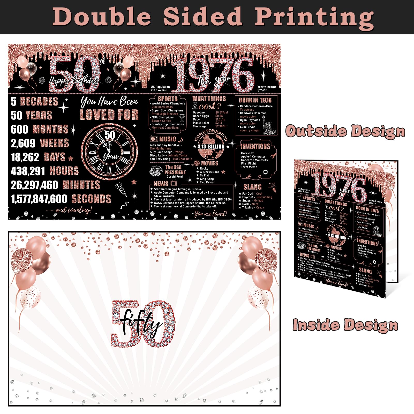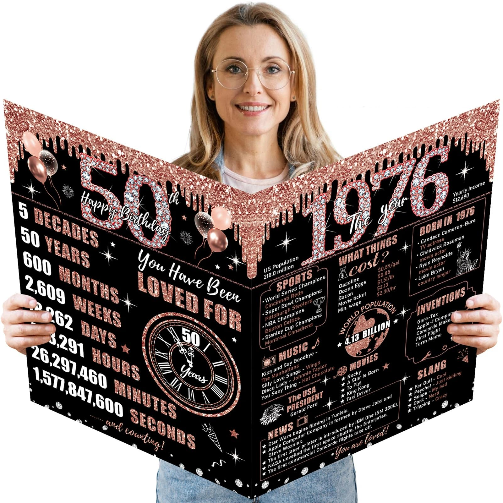 Stunning Design: 50th birthday cards for women with glitter rose gold details and exterior. It's printed with all sorts of fun facts about 1976. Make this 50 birthday card simply gorgeous for the womens 50th birthday celebration