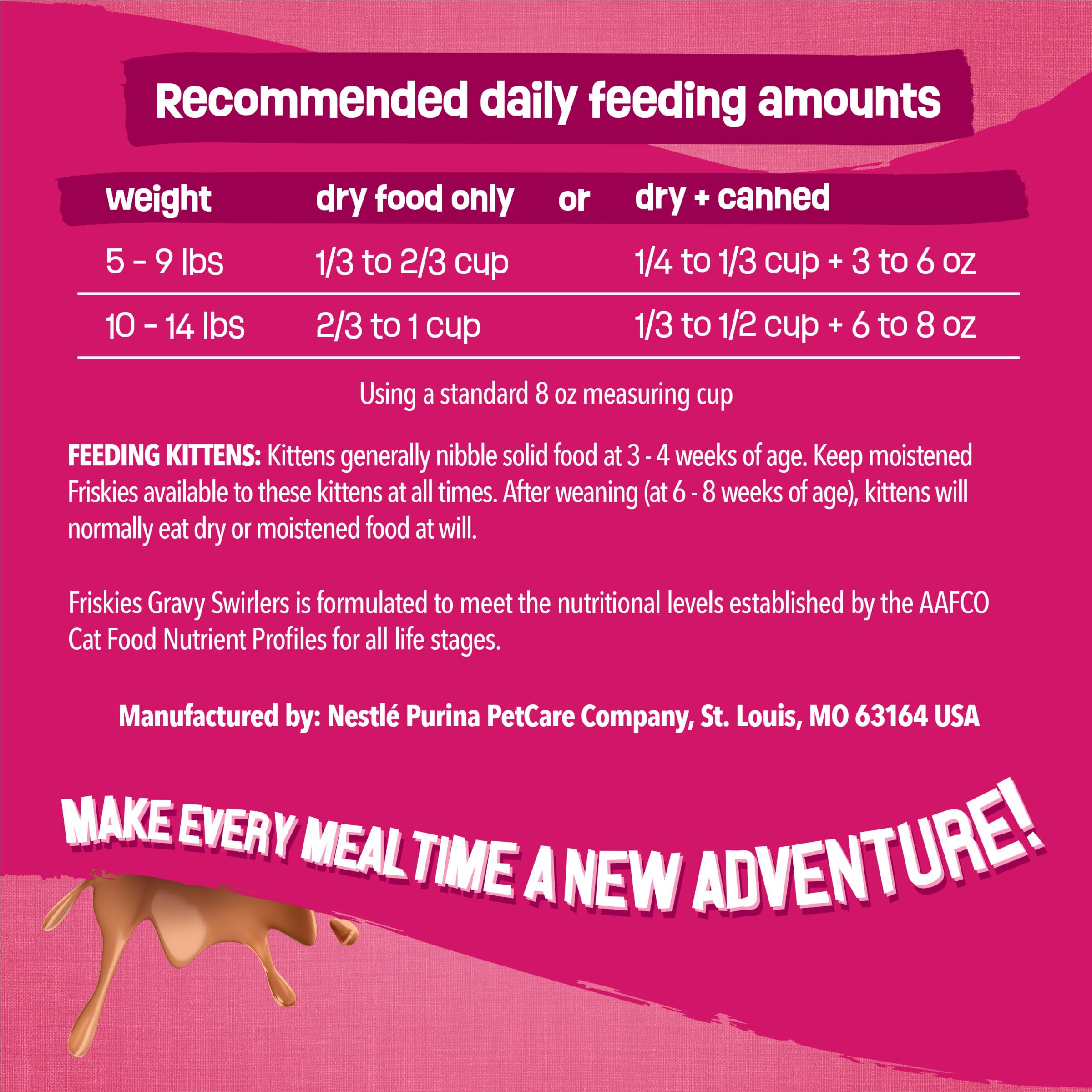 Bring the deliciousness of gravy mixed with two cat-favorite flavors to your cat's dish with Purina Friskies Gravy Swirlers dry cat food. Savory chicken and salmon flavors combine to create the taste cats crave, and there's gravy baked into each bite for added yum. Let the sound of the mouthwatering kibble hitting her bowl pique your cat's attention, and watch as she delights in every last delicious bite. This dry cat food recipe features essential vitamins and minerals for the everyday nutrition your cat needs to be her best self. Because it's formulated for all life stages, this mouthwatering meal can follow your cat companion from her playful kitten days all the way through to her adventurous adult years. Give your cat the 100 percent complete and balanced nutrition she deserves along with the taste she adores every time you offer up a helping of this Purina dry cat food. Fill your cart with Purina Friskies Gravy Swirlers to be one step closer to filling her dish with a taste she loves.