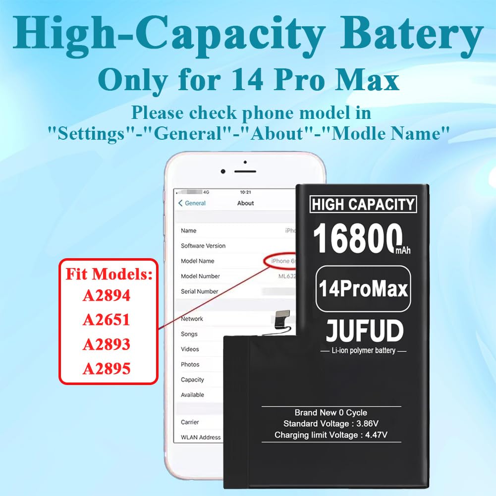 【Strong power】JUFUD replacement battery used for iPhone 14 Pro Max, top lithium polymer cell, 16800mAh large capacity, 0 cycles of new electricity, durable to 1800 cycles, strong battery life, goodbye to power anxiety.