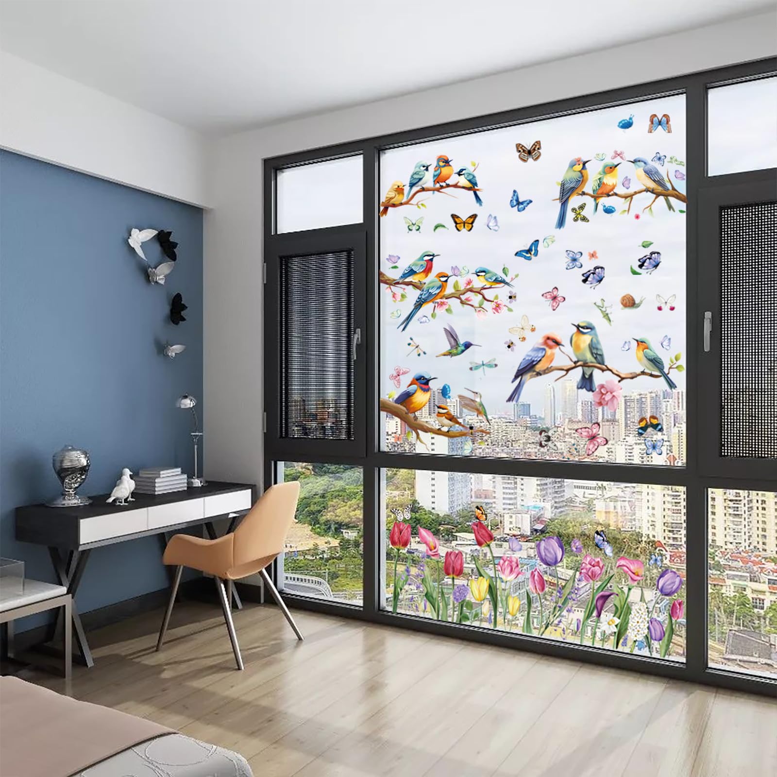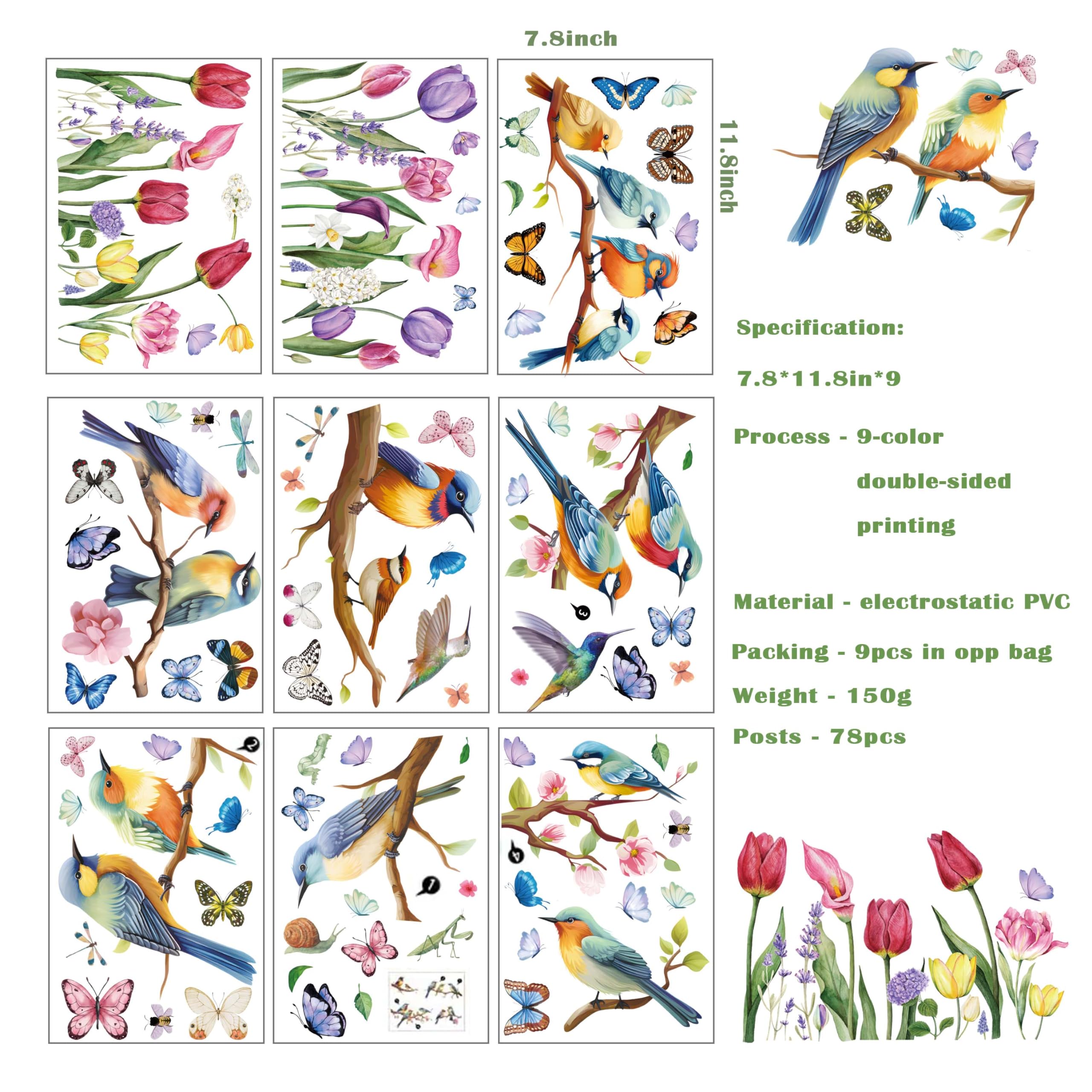 Vibrant Design Elements: Bursting with vibrant hues, our window stickers feature tulips, butterflies, hummingbirds, and dragonflies that come to life in a double-sided print. This picturesque scene is adorned with the charming addition of butterfly wall decals, creating a visual symphony that captivates the eye.