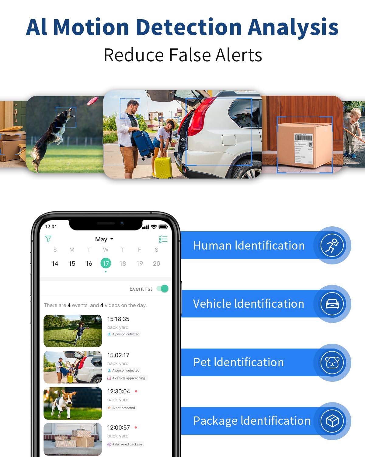 【PIR/AI Motion Detection & Real-time Alarm Notification】The security camera outdoor utilize highly efficient PIR motion detection technology to monitor activity in your home in real time. Powered by advanced AI technology, they intelligently analyze captured footage and distinguish between people, pets, packages and vehicles. Receive real-time alerts on your smartphone to ensure you receive timely and accurate notifications while avoiding false alarms.