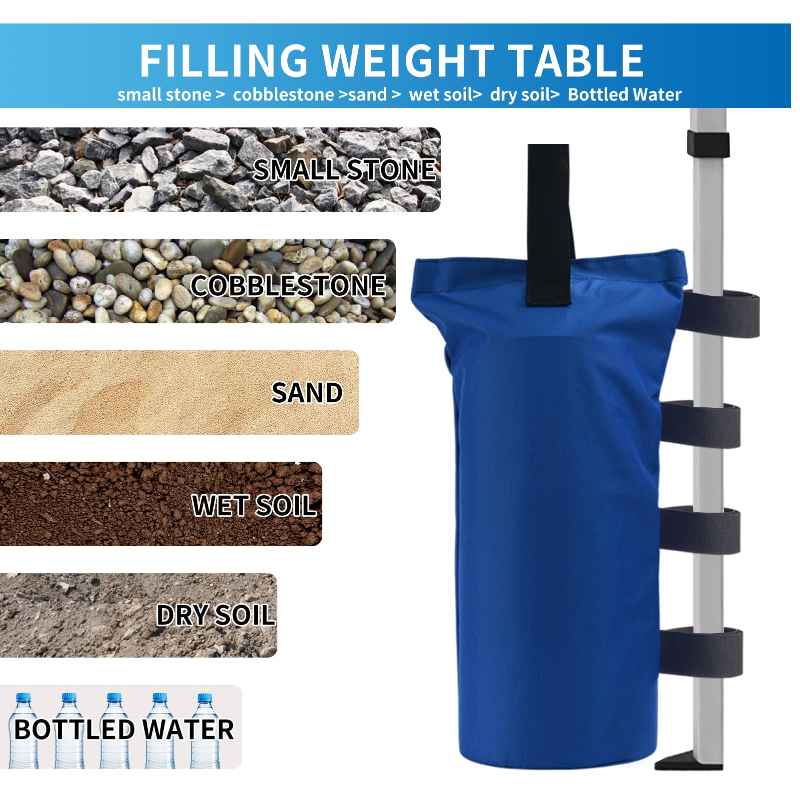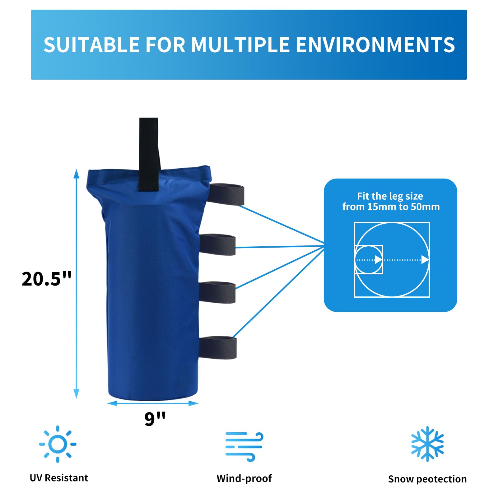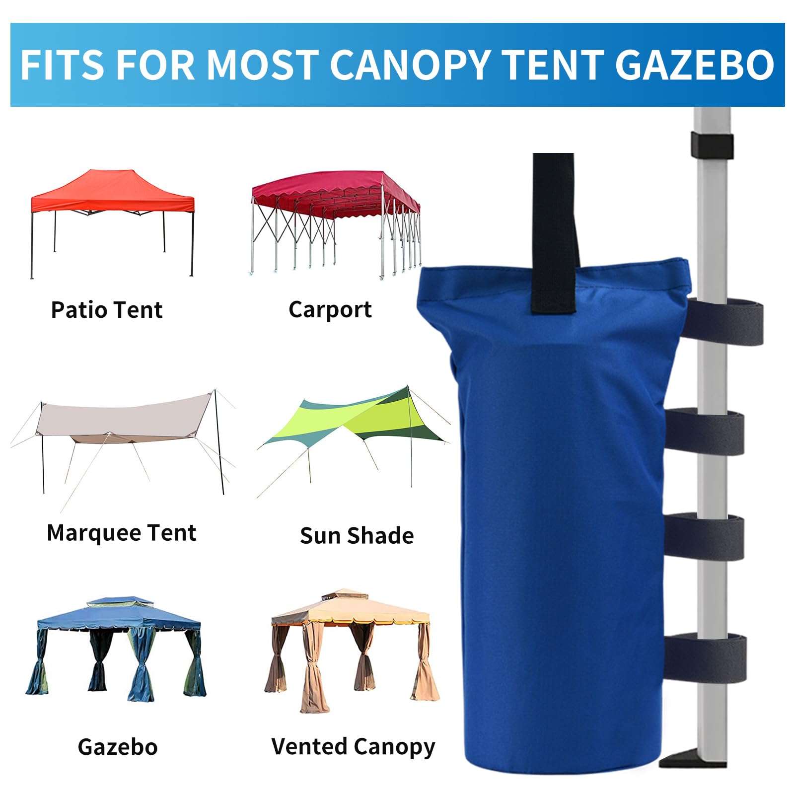 ♻Four Velcros: The handle and 4 Velcro straps design make the sand weight bag easy to attach to your frame leg, the high quality velcro will ensure the weight bags stay securely attached to your canopy tent legs.
