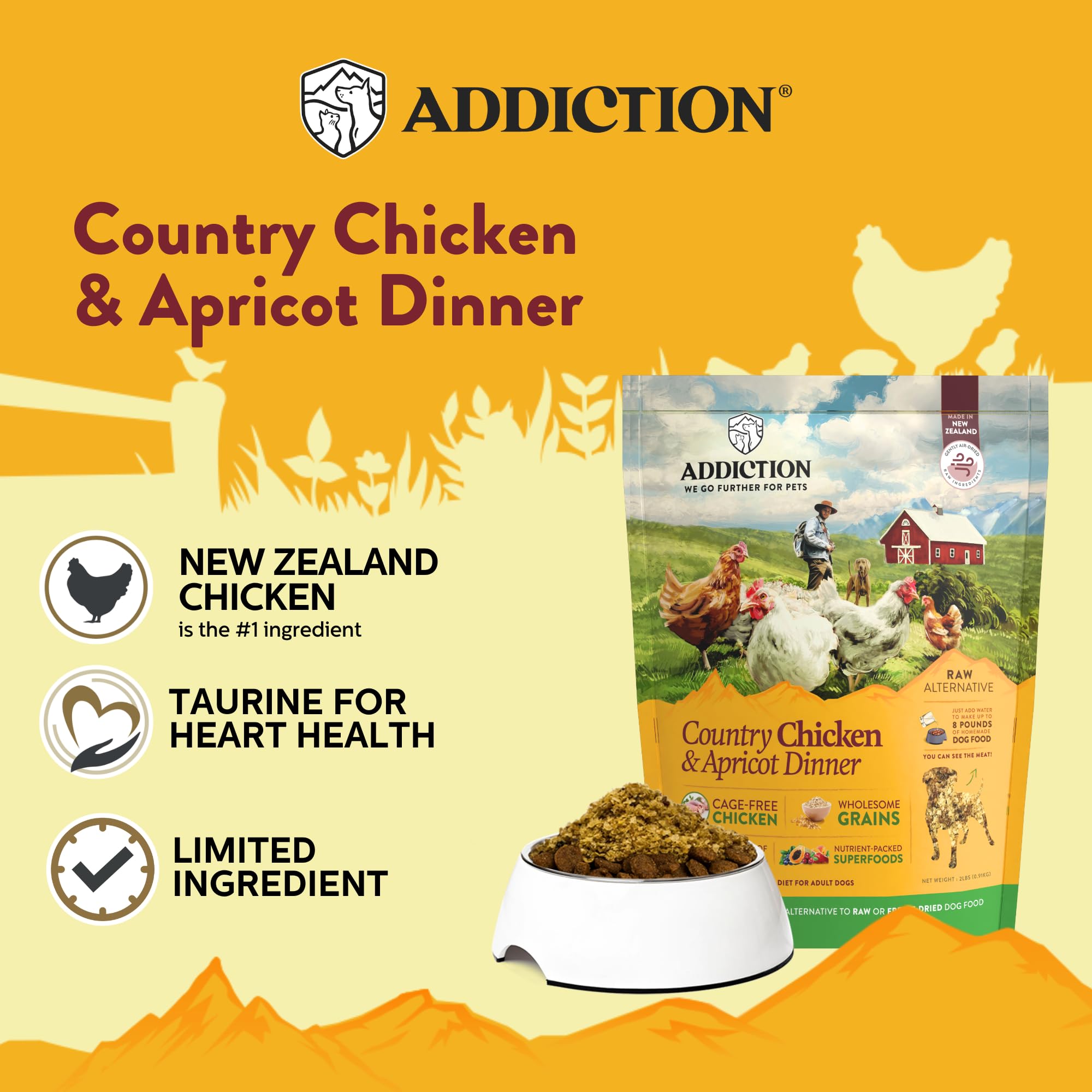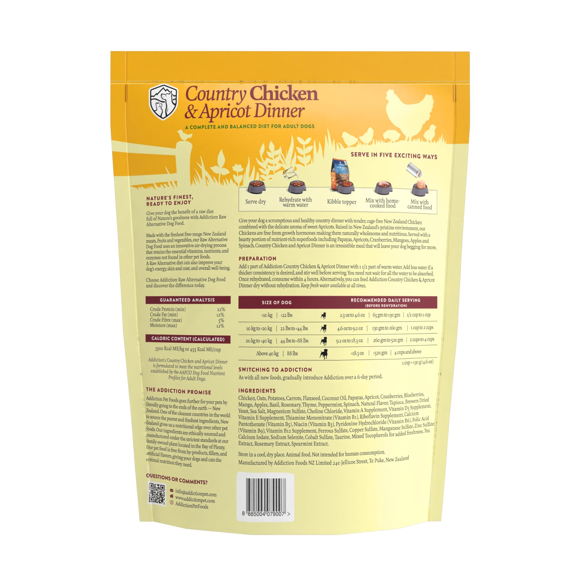 Give your dog a scrumptious and healthy country dinner with tender New Zealand chicken flavored with the delicate aroma of sweet apricots. With chunky chicken pieces that you can see, served up with a hearty portion of potatoes and carrots, this irresistible grain-free meal will leave your dog begging for more.