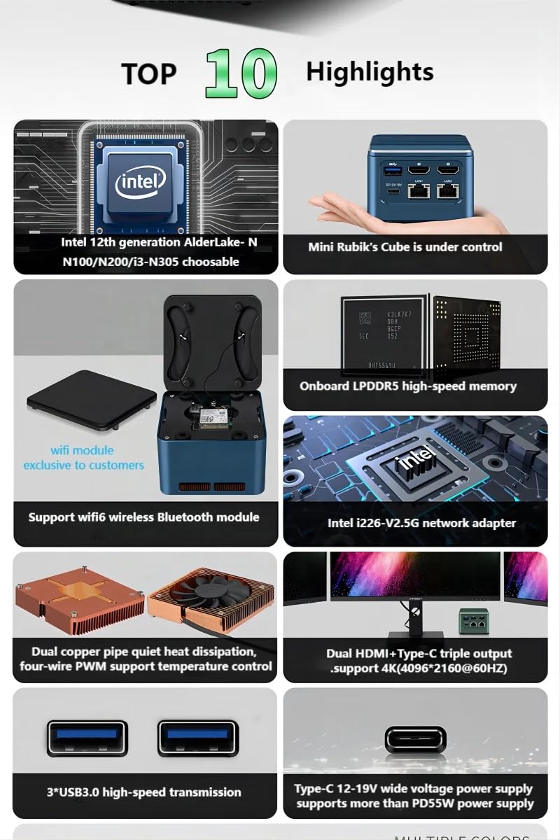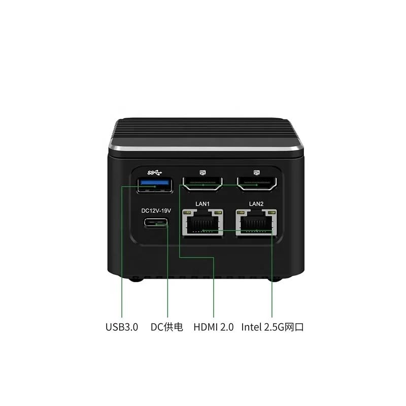 Product Highlight N100 model: -2 x 2.5G i226-V Network Card Chip -3 x USB3.0,1 x Type-C,can be upgraded to 3.1 signal through BIOS. Type-c does not support power supply. -Onboard 8G/16G LPDDR5 4800MHz Max 16GB . -1 x M. 2 2242(PCle3.0×1)NVMe is compatible with NGFF protocol and can be upgraded to ×2 signal through BIOS. -Wifi:1 x M. 2E key slot supports RTL 8852BE&Intel AX210 WiF6 modules -Support 2 x HDMI 2.0(4096× 2160@60Hz) 1 x Type-C(4096× 2160@60Hz) Triple display - Realtek ALC897 pitch 2.1 2-in-1 audio interface. -Double copper tube fin heat dissipation +PMW four-wire temperature control mute ball fan. -BIOS: AMI EFI BIOS supports automatic call initiation, network wake-up and PXE. -Power Supply :DC-IN 12-19V Wide Voltage (Type-C Interface) 100-240VAC,50/60Hz for chargers above PD 55W. Working Environment: -10-75℃ ,10%-90% relative humidity. Operating System:Windows10、 Windows11、Linux size :75.4mm*75.4mm*52.5mm