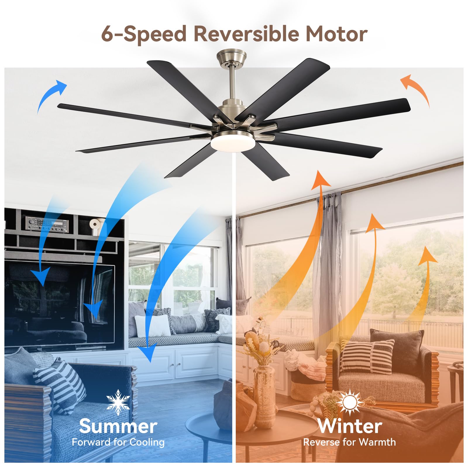 Dynamic & Year-Round Efficiency - A high-efficiency DC motor of this large black ceiling fan with light drives 6 tailored wind modes - from sleep-soft whispers to vigorous cooling. The innovative reverse function solves winter’s "heat trap," recycling warmth downward to cut heating costs by 10% and balance floor-to-ceiling temperatures.