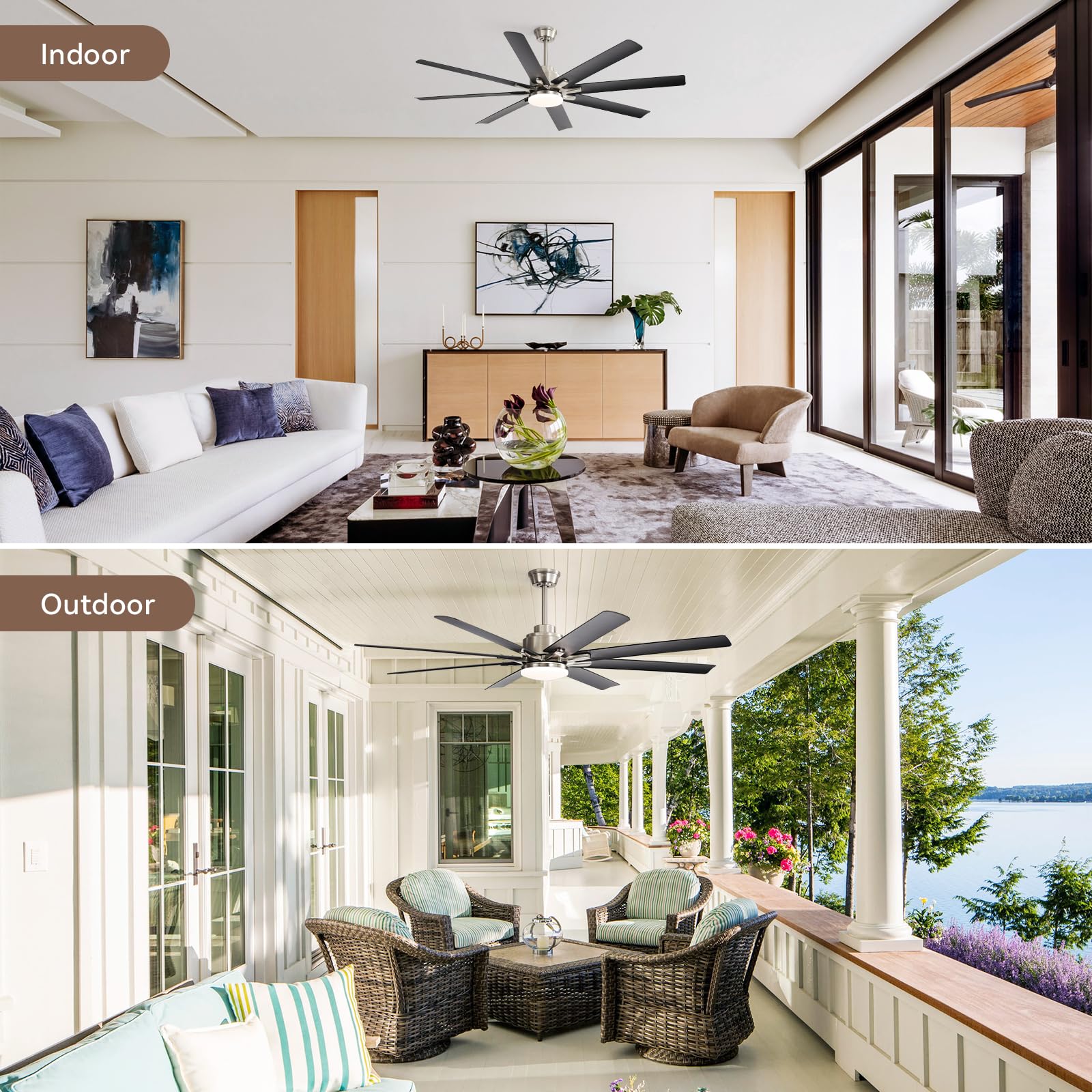 Versatile Refinement - Adapts flawlessly with 3 downrods (5",10",24") and ±15° tilt for any ceilings. Damp-rated ceiling fans for covered outdoor enjoyment, like patios, gazebos, gateway etc, its elegant design of the modern ceiling fan with light elevates interiors for bedroom, living rooms, kitchens, studies, farmhouse, or great rooms.