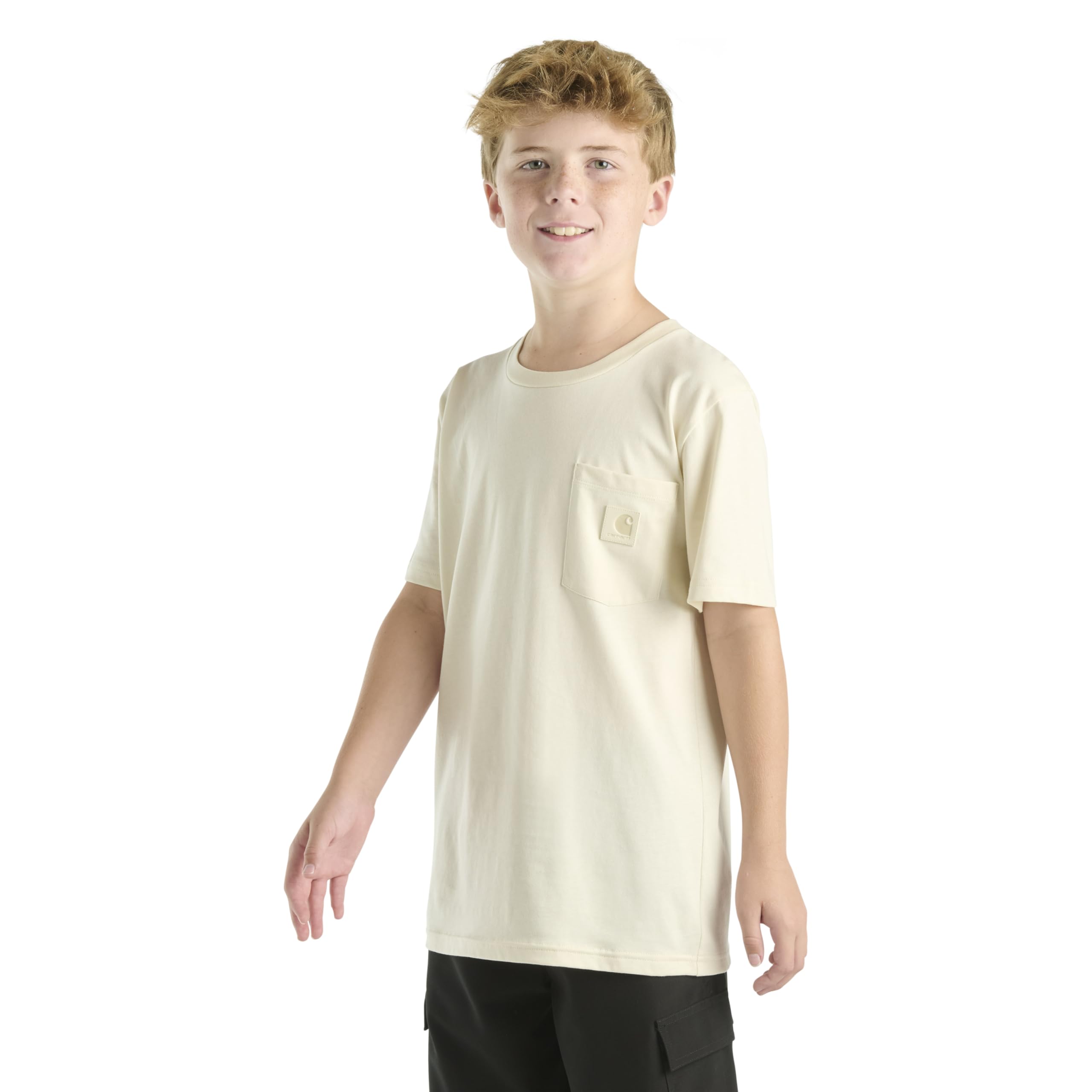 Description Fun-size Carhartt with full-size durability. This kids’ Re-Engineered Garment Dye Pocket T-Shirt is made from 5.3-ounce, 100% cotton jersey that feels soft from the start but stands up to whatever the day brings. Side-seam construction helps reduce twisting, keeping the fit comfortable and the shape consistent. A rib-knit crewneck slips on easily, and the classic left-chest pocket with a sewn-on Carhartt label completes the signature look. The perfect everyday tee for kids who play hard — built with the strength you expect from Carhartt.