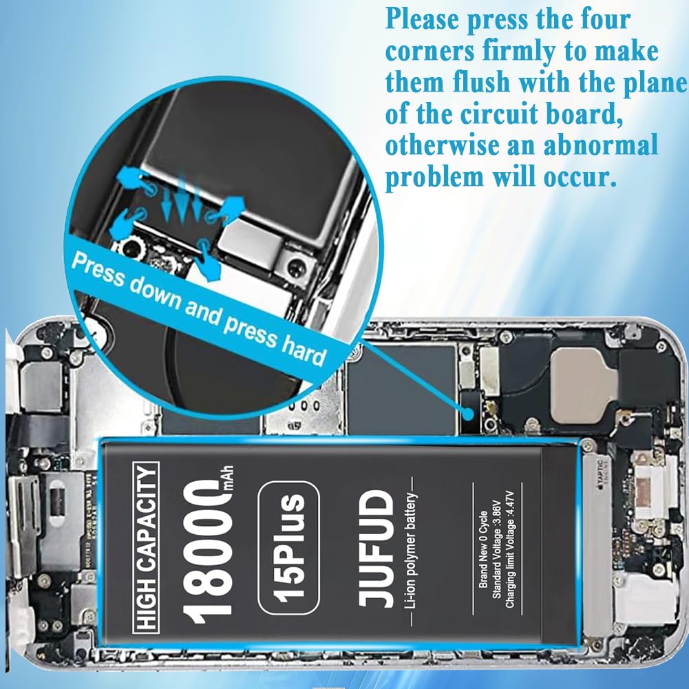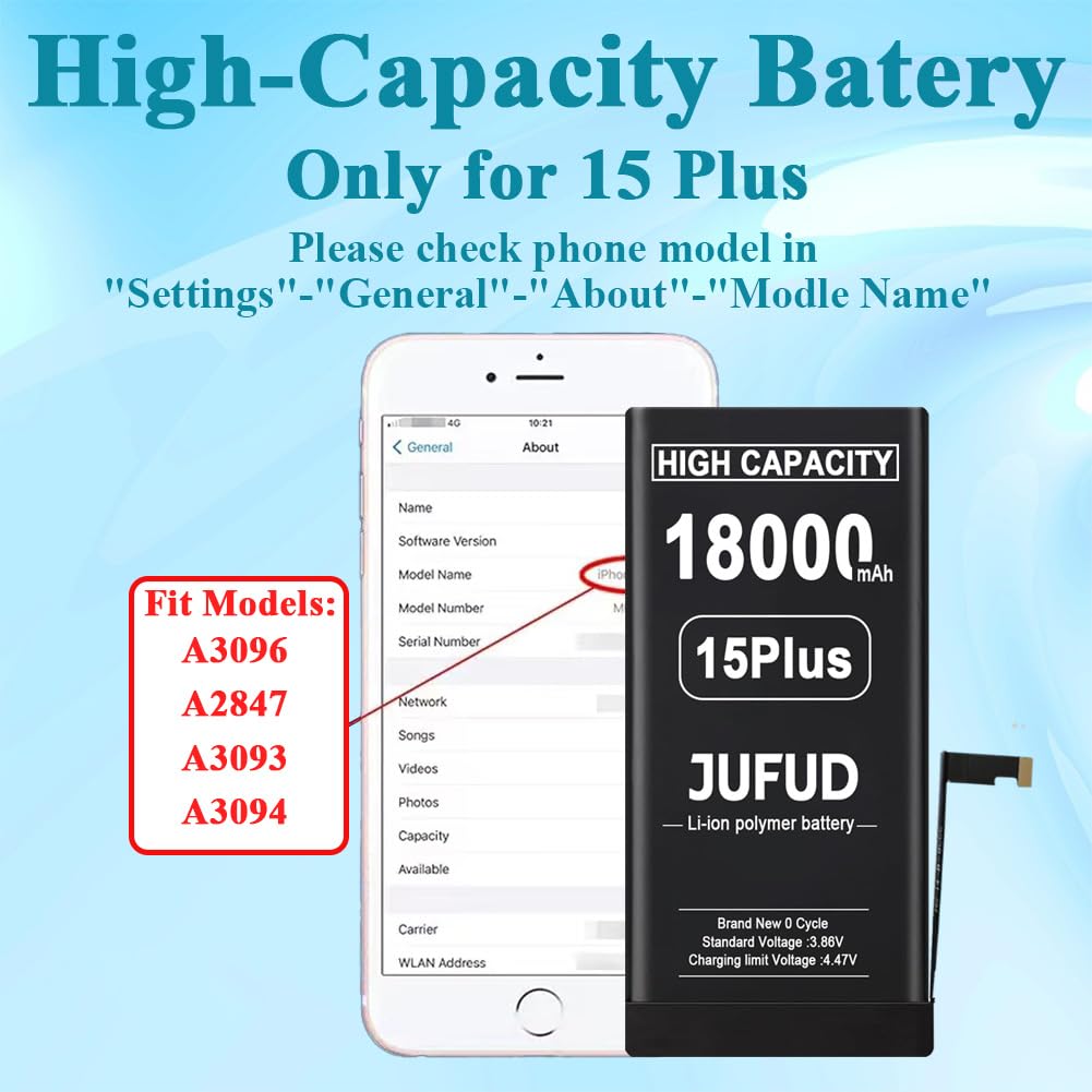 【Strong power】JUFUD replacement battery used for iPhone 15 Plus, top lithium polymer cell, 18000mAh large capacity, 0 cycles of new electricity, durable to 1800 cycles, strong battery life, goodbye to power anxiety.