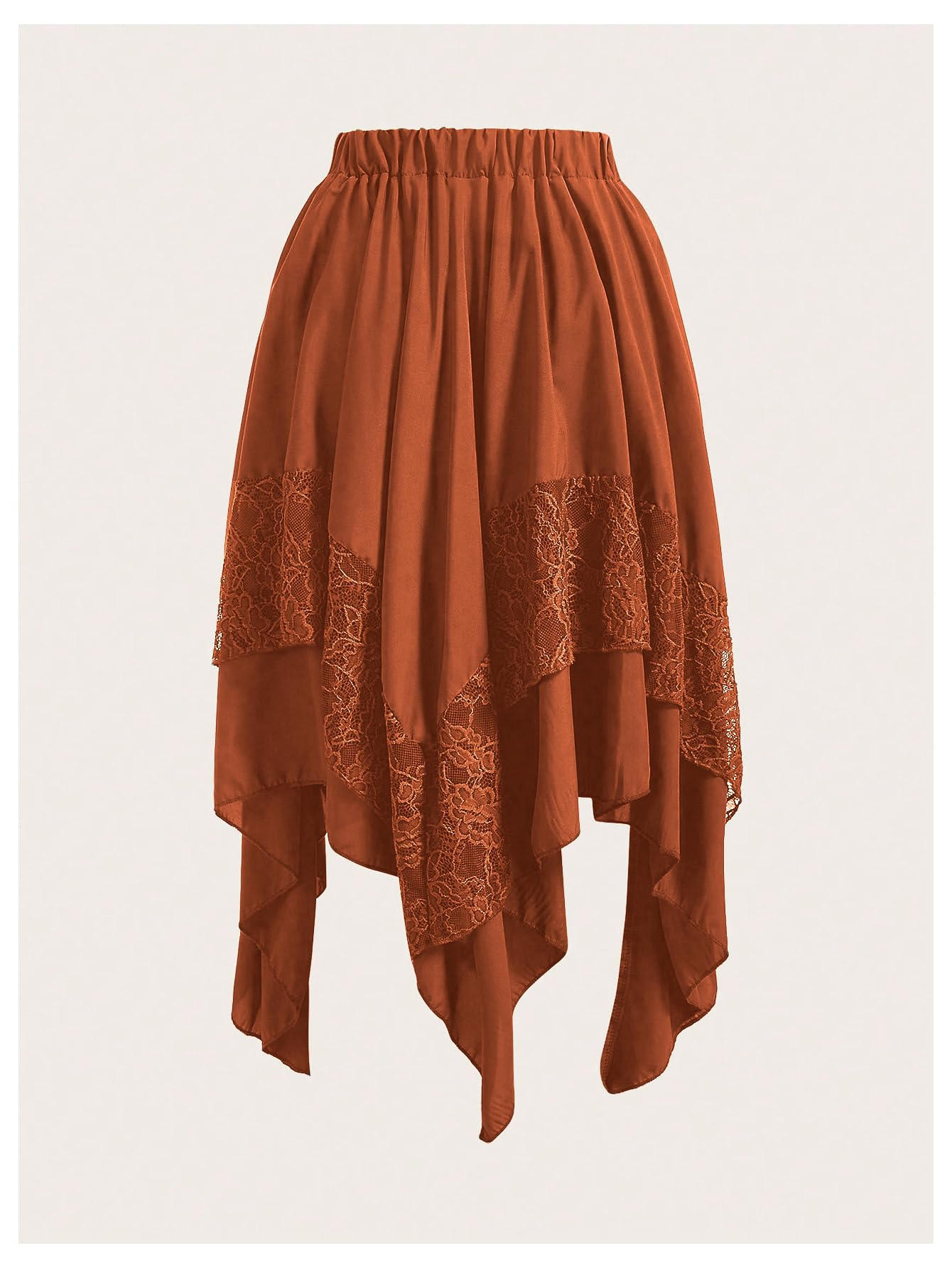Elastic Waist, Lace Trim, Asymmetrical High Low Hem, A Line, Flowy, Gothic Steampunk Skirt, Casual Midi Skirt