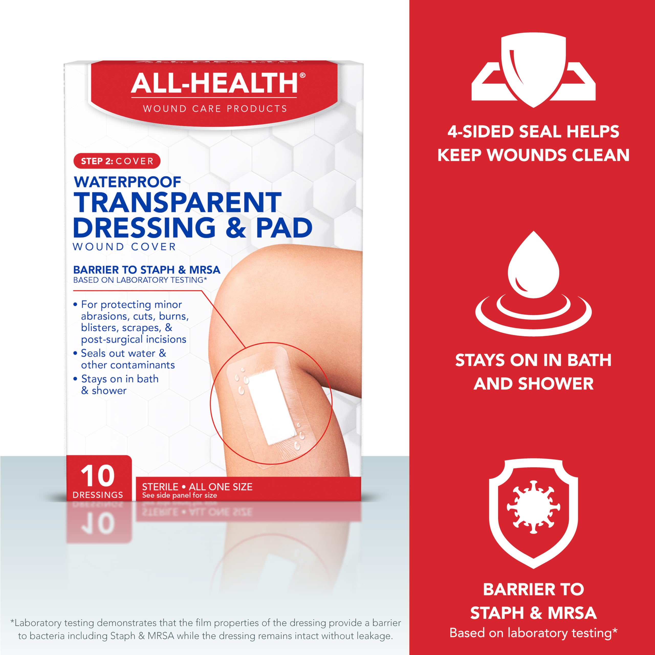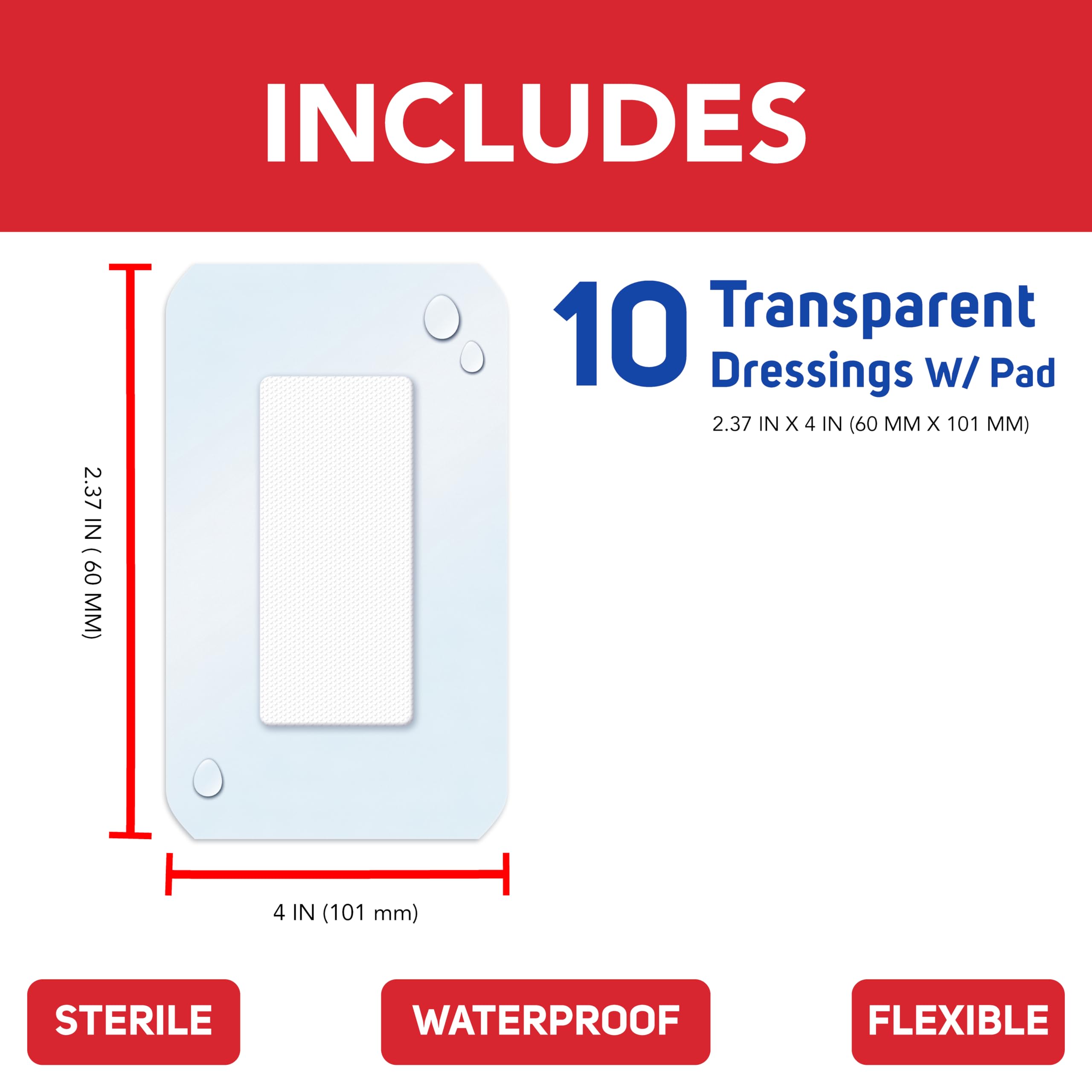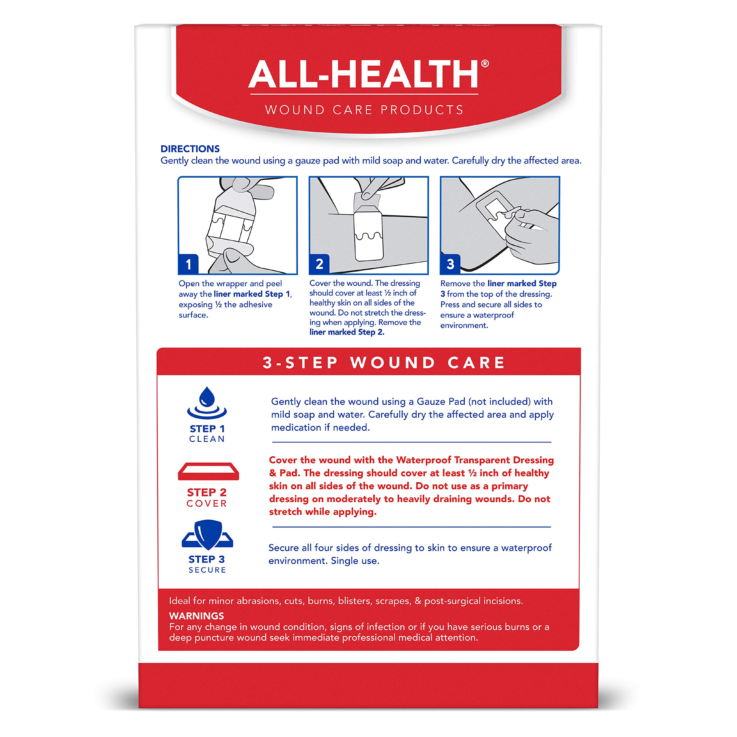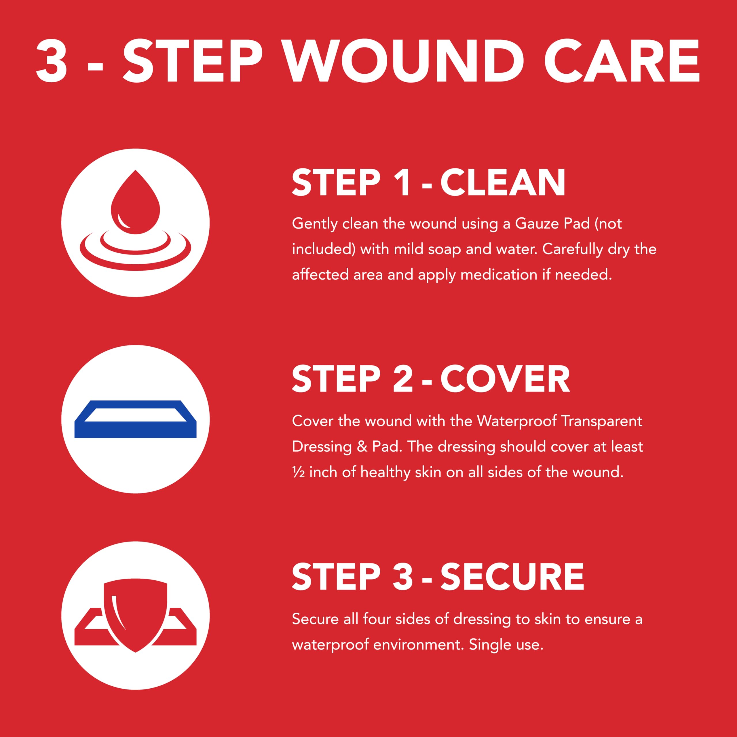 Waterproof transparent dressing + pad sterile. 3-step wound care: 1. Gently clean the wound using a gauze pad with mild soap and water. Carefully dry the affected area. 2. Cover the wound with the transparent dressing & pad. 3. Secure all four sides of dressing to skin to ensure a waterproof environment.