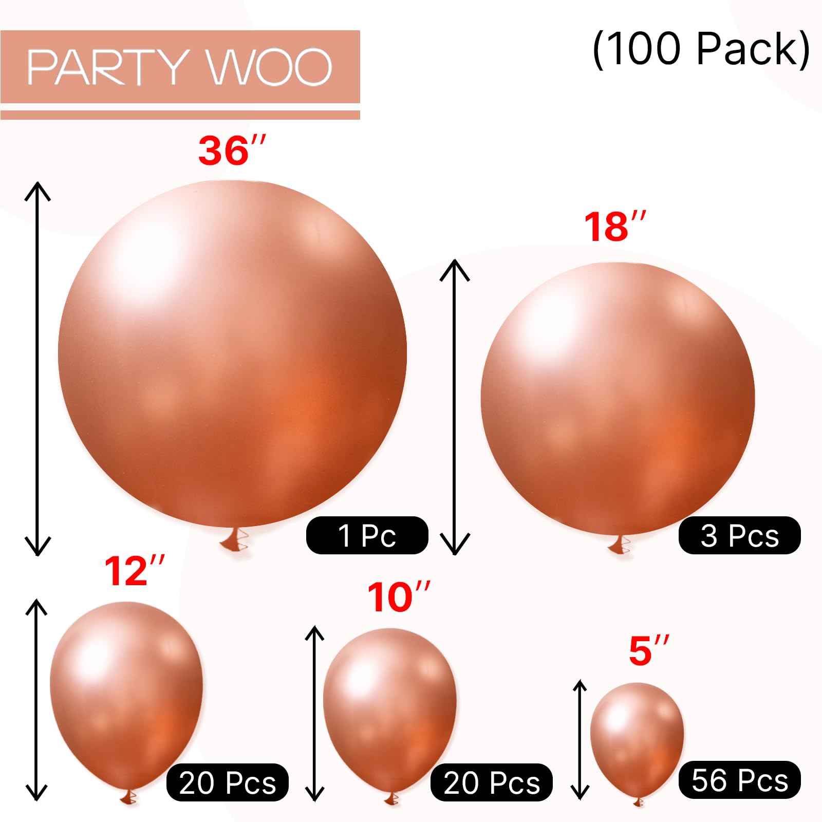 Package includes: 36 inch rose gold balloons (1pcs),18 inch balloons (3pcs), 12 inch balloons (20pcs), 10 inch balloons (20pcs), 5 inch rose gold balloons (56pcs), pay attentions that 5 inch balloons could NOT float when inflated with HELIUM.