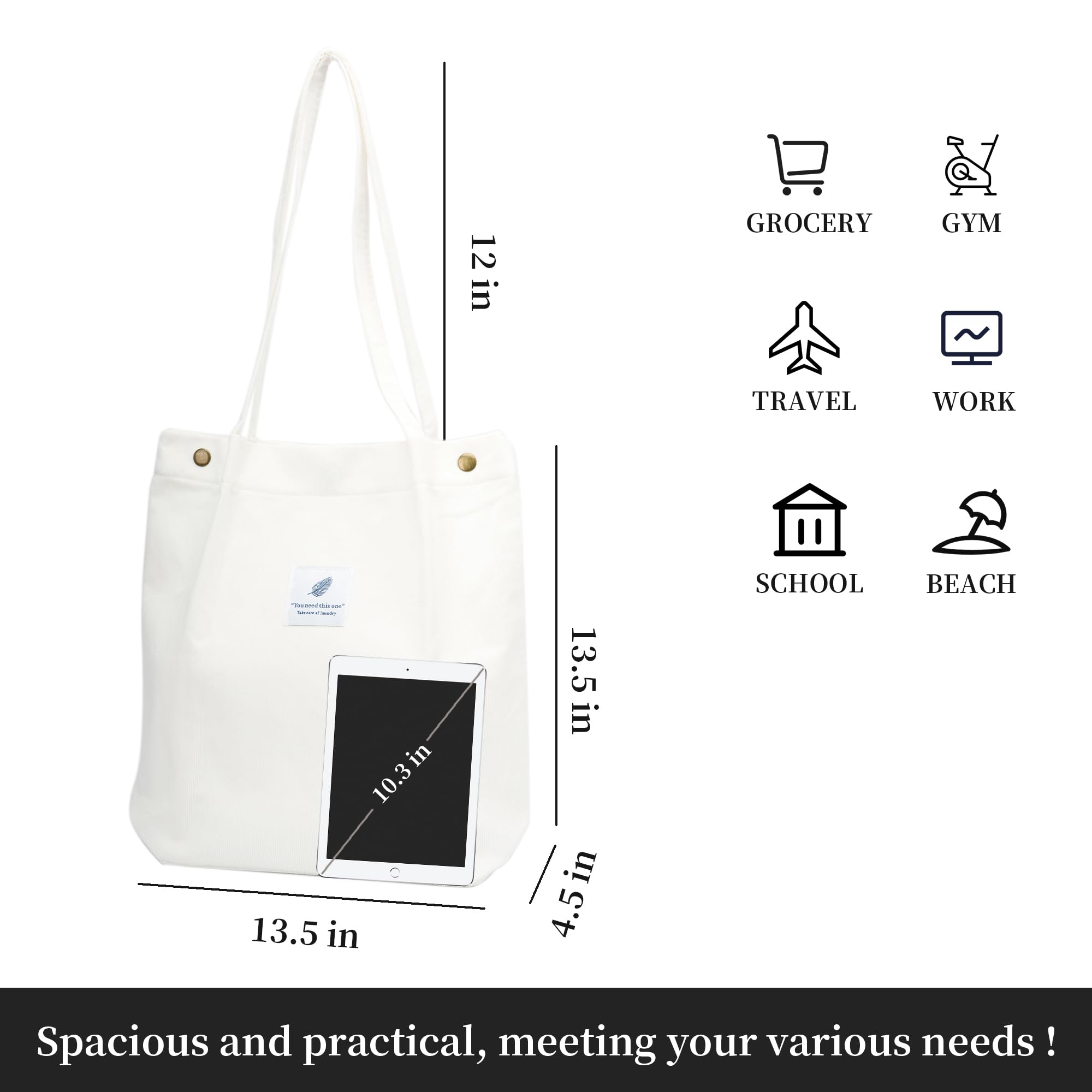 IDEAL SIZE: The cute tote bag measures 13.5 x 12.5 x 4.5 inches and the shoulder strap is 12 inches long, lightweight and portable, with enough capacity for daily shopping, travel, office, easily holds water bottles, iPads, mobile phones, A4 size magazines, wallets, toiletries, cosmetics, clothes, drinking glasses, umbrellas, etc.
