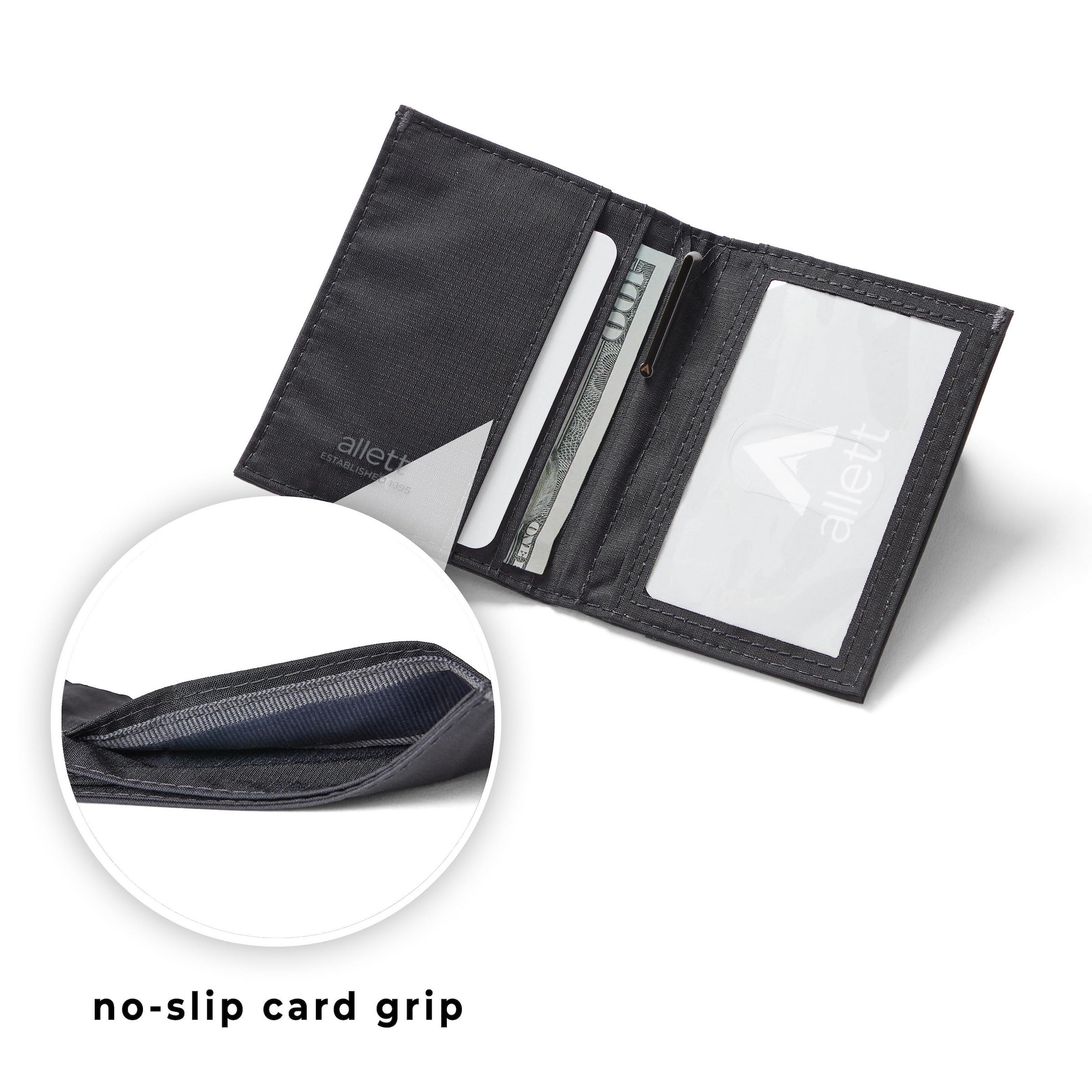 FEATURES & CAPACITY: Holds 3-10+ cards and folded bills. This incredibly skinny card wallet is an excellent front pocket wallet. Each card pocket is lined with a slim silicone grip to securely hold your cards in place. A hybrid between a wallet and a card holder, the vertical design is complete with a clear ID pocket and a tiny pocket to hold the Allett Micro Pen (sold seperately).