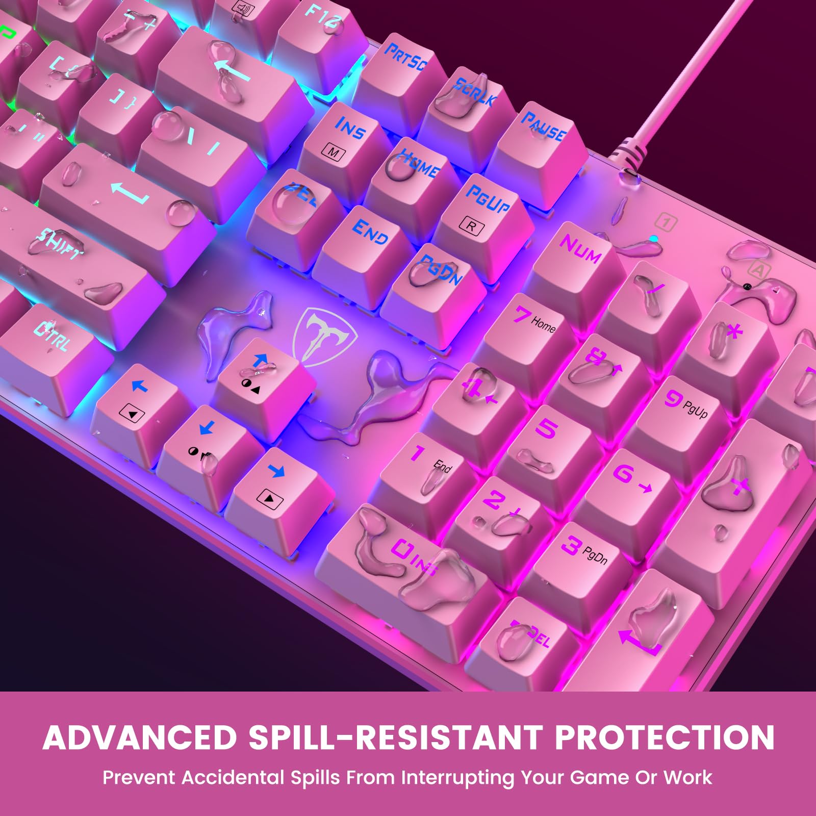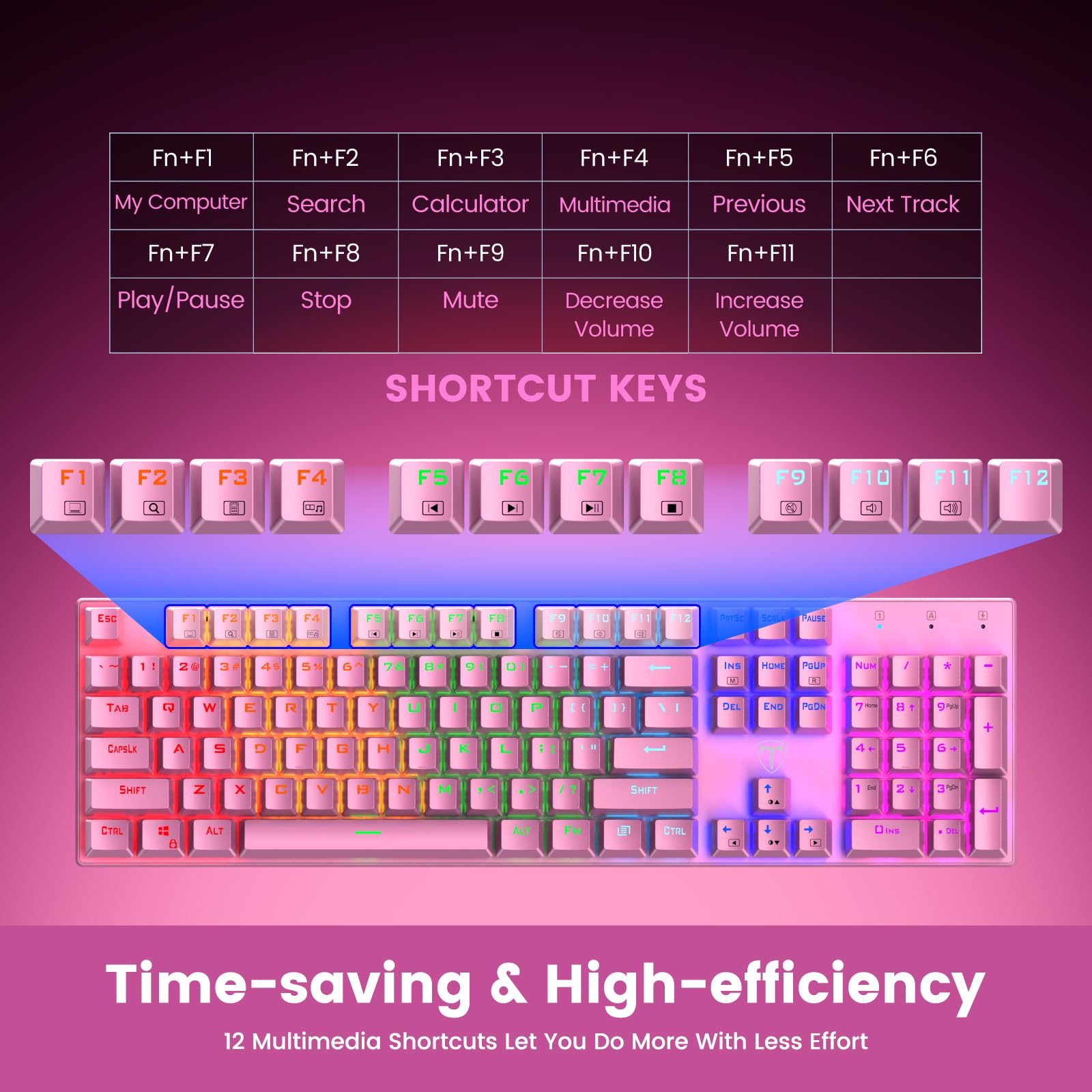 【High-end 104 Keys Full-Size Keyboard】The Win lock function frees your worry about mistyping when gaming(Fn+Win).Keycaps are pluggable and easy to clean,saving you much unnecessary trouble.We designed 4 hydrophobic holes for this keyboard,allowing water to flow away quickly to prevent damage to the keyboard.No longer afraid of accidents.(✦Include a keycaps puller for cleaning or other needs.)