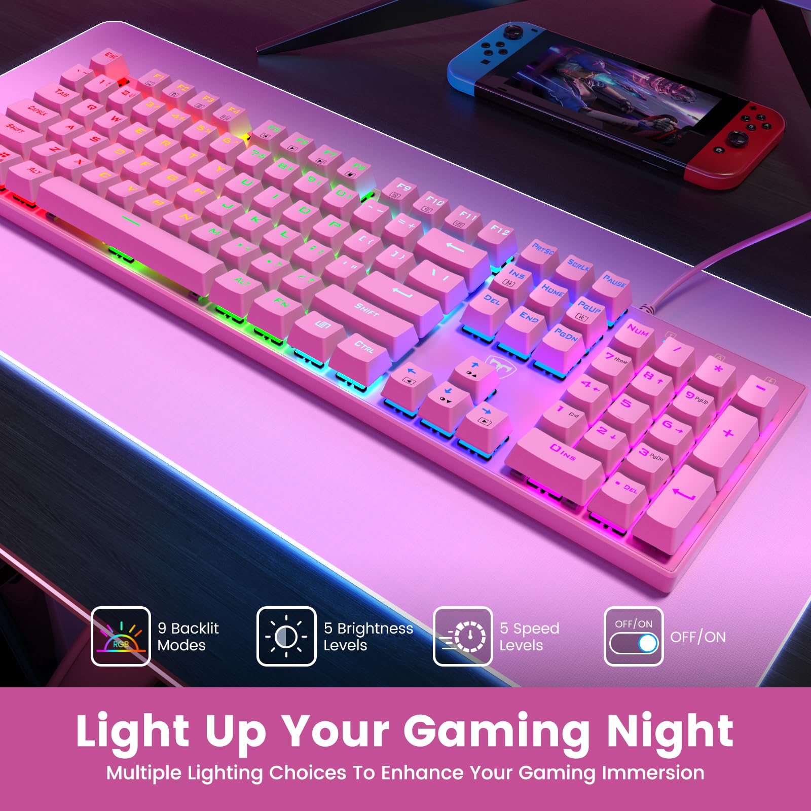 【Rainbow Backlit Keyboard: illuminate Your Desktop】With 9 different backlights,5 levels of light speed and brightness,this computer keyboard enriches your gaming experience and improves your mood greatly,which is a great addition to your desktop,especially in the dark.Plus,the ultra-durable double injection ABS engineered keycaps provide crystal clear uniform backlight and greatly improve your typing accuracy at night.