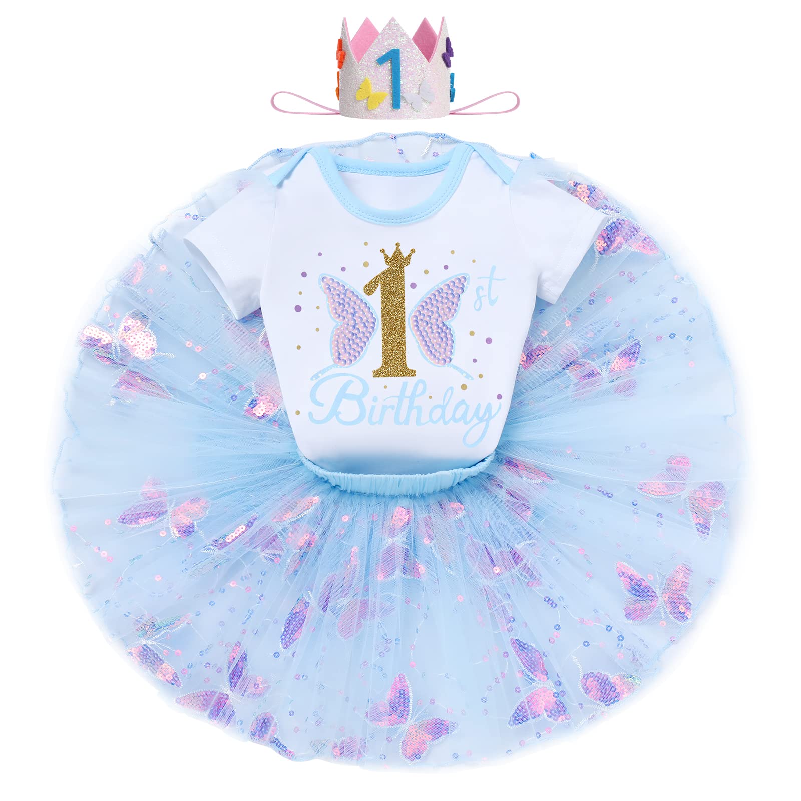 3PCS Butterfly 1st Birthday Outfit Baby Girl Tutu Skirt Set: Cute butterfly first birthday outfit for baby girl, butterfly baby girl tutu set for butterfly birthday party. Baby girl butterfly baby shower outfit for cake smash photo shoot props, 3PCS set, Short Sleeve butterfly Romper and Sequins Butterfly Tutu Skirt and Headband. Dress your little princess up with our Butterfly Themed Birthday Outfit for her first Birthday. Best as Princess Birthday Gift for 12 months 1 year old baby girl.
