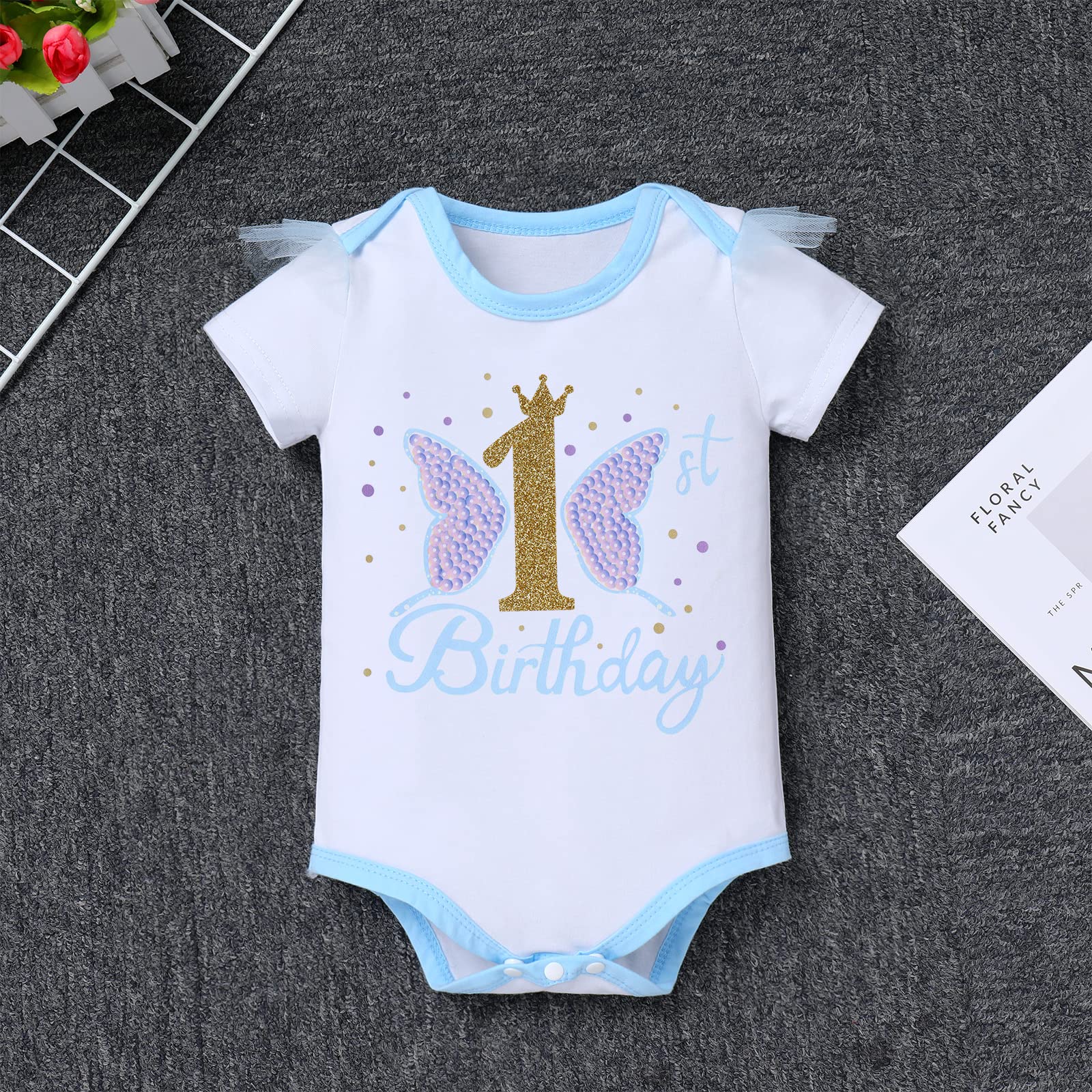 1st Birthday Butterfly Theme Outfit: Baby girls butterfly 1st birthday tutu outfit sequins butterfly romper tutu skirt headband princess dress up costume outfits. White flutter ruffle short sleeve o-neck romper, designed 1st birthday butterfly sequins wings and gold crown "1", glitter My 1st Birthday One letters, special for baby butterfly theme birthday party supplies. Bodysuit lapped shoulder with flying mesh, cute and lovely. Open crotch with 3 snaps for changing diaper conveniently.
