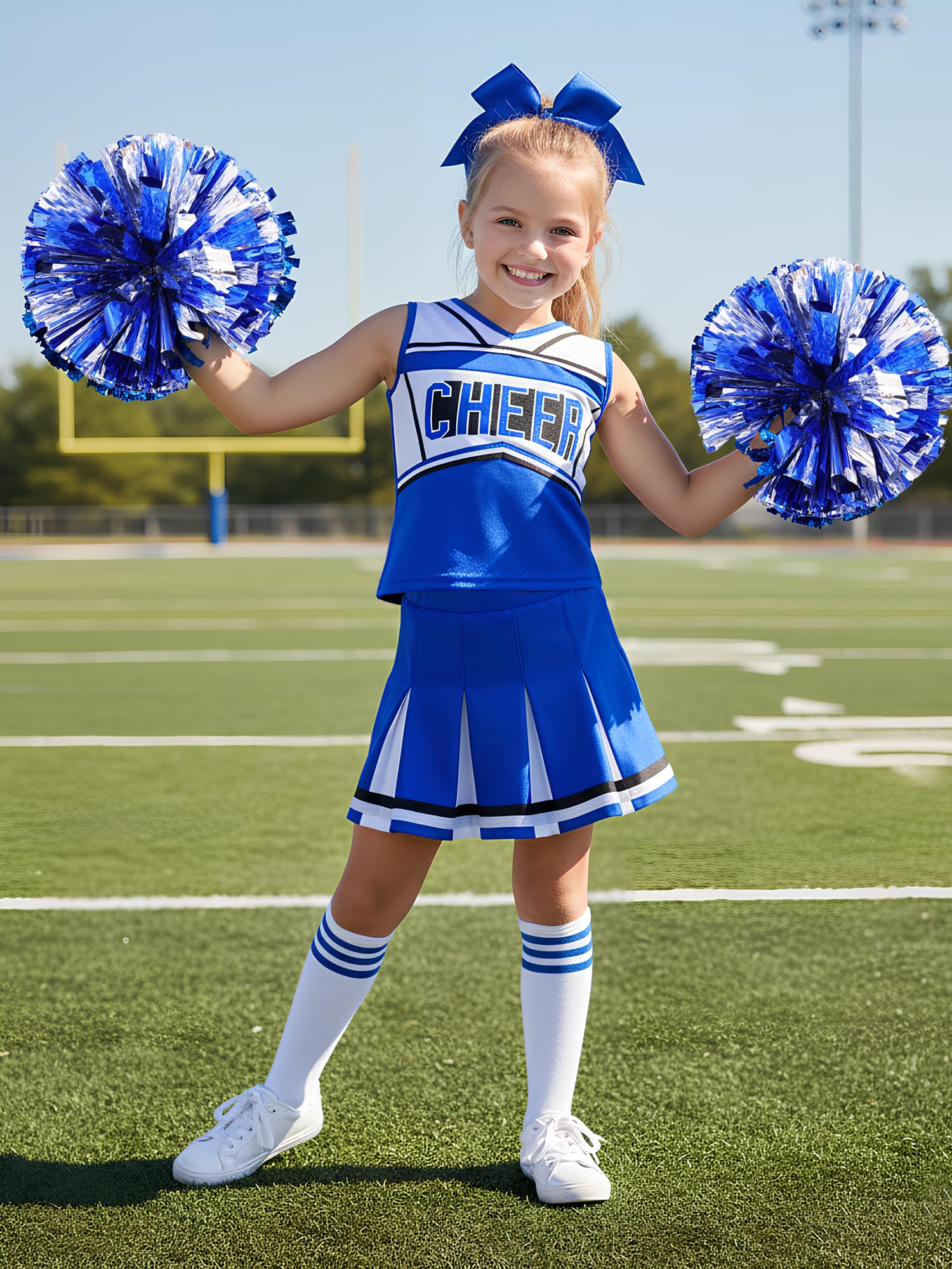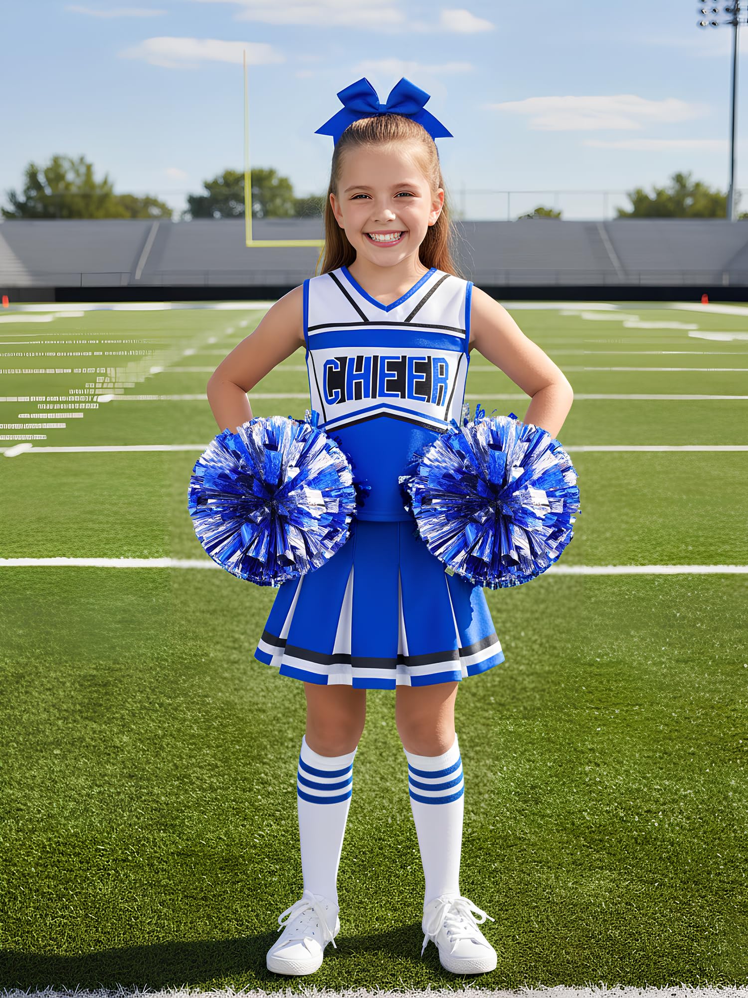 Complete Cheerleader Ensemble Set:Includes all essential items: "CHEER" lettered top, matching skirt, pom poms, hair bow, and knee-high socks for instant team-ready appearance.