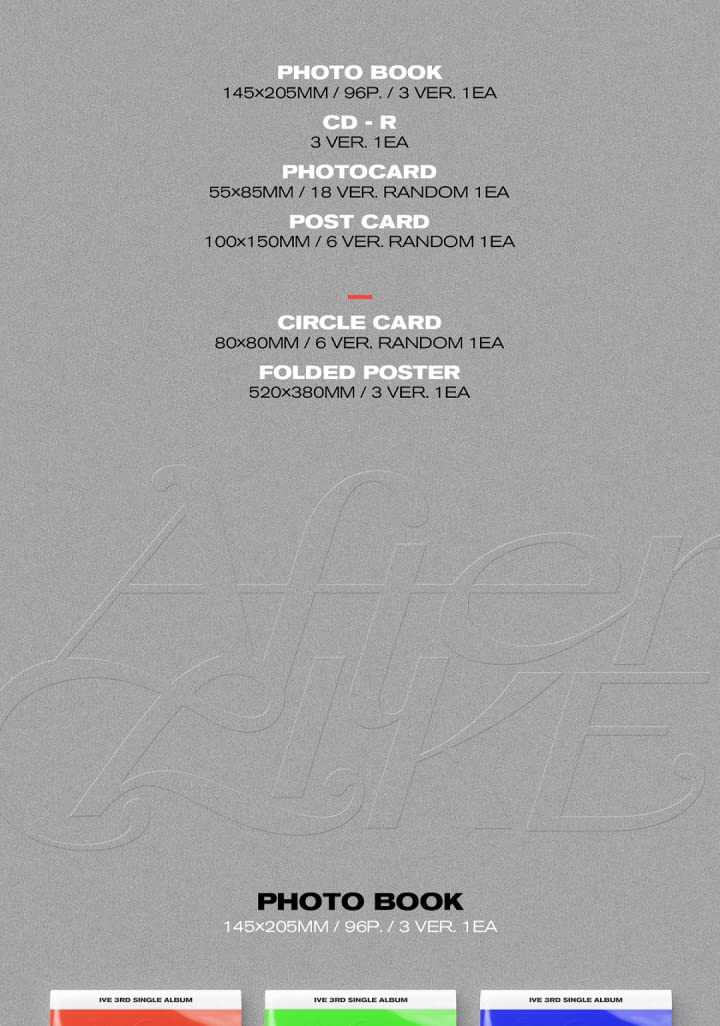 IVE After Like 3rd Single Album PHOTOBOOK Version Release Date - 23rd August, 2022 CD+1p Folding Poster On Pack+96p Photo Book+1p Photo Card +1p Post Card+Pre-Order Benefit+ Tracking Number. Depending on versions , contents inside the album may differ. Pre-Order Benefit(Folding Poster, CircleCard) is randomly included inside some of the first press albums. Track List Disk(CD) 1. We will be updated soon... ✔Officially distributed Brand New Original item from Manufacturer. ✔All items from original manufacturers are delivered in original sealed package condition. ✔Your purchase quantity will be count on Korea HANTEO GAON Chart! ✔All ordered item will be shipped with a tracking number.