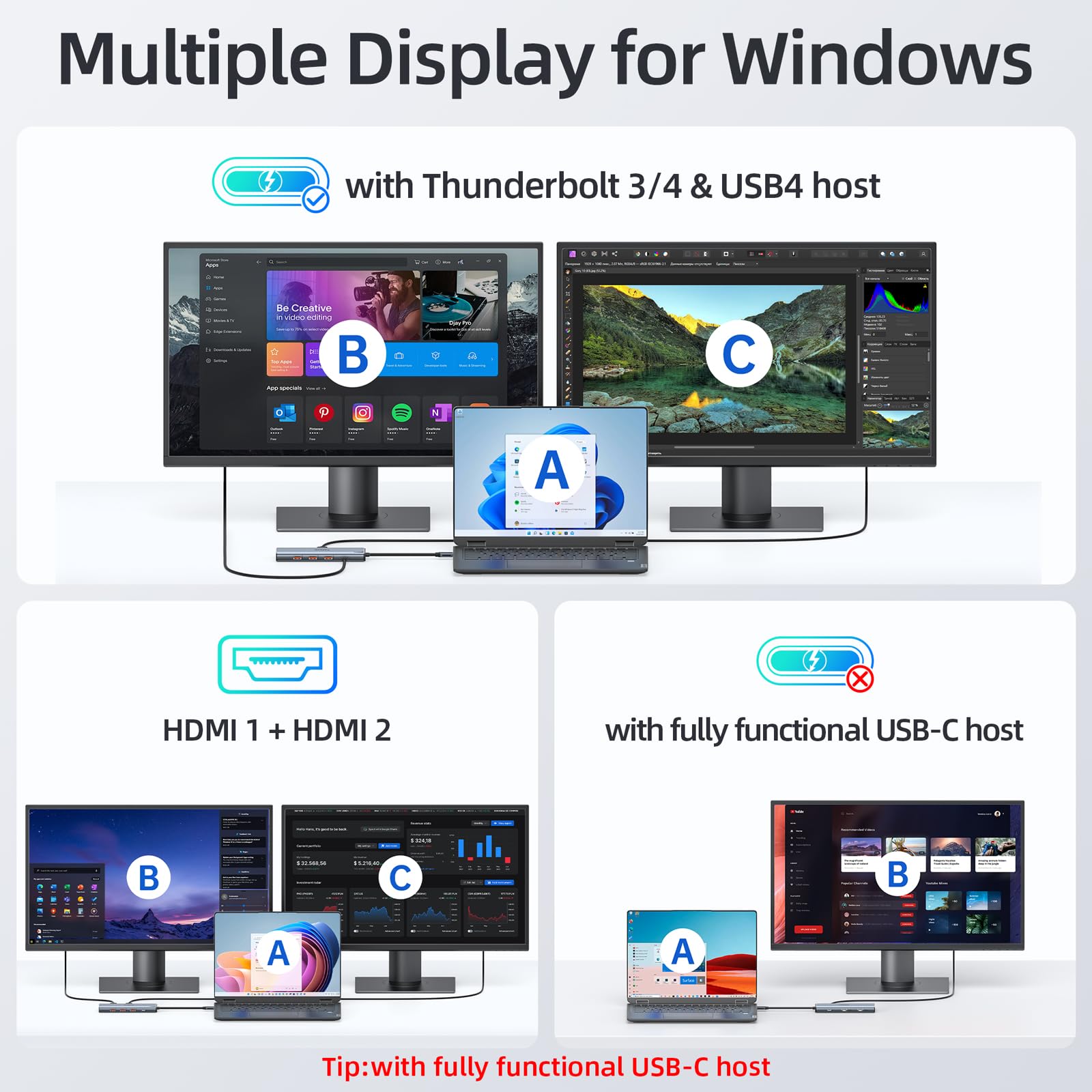 【Extend Monitor】1*USB-C Display Docking Station ports and 2HDMI, support 4K@60Hz display, 10Gbps Data Transfer and 4.5W charging. Warm tip: Video output only applicable to laptops with fully functional USB-C ports, Thunderbolt 3/4, and USB4 ports