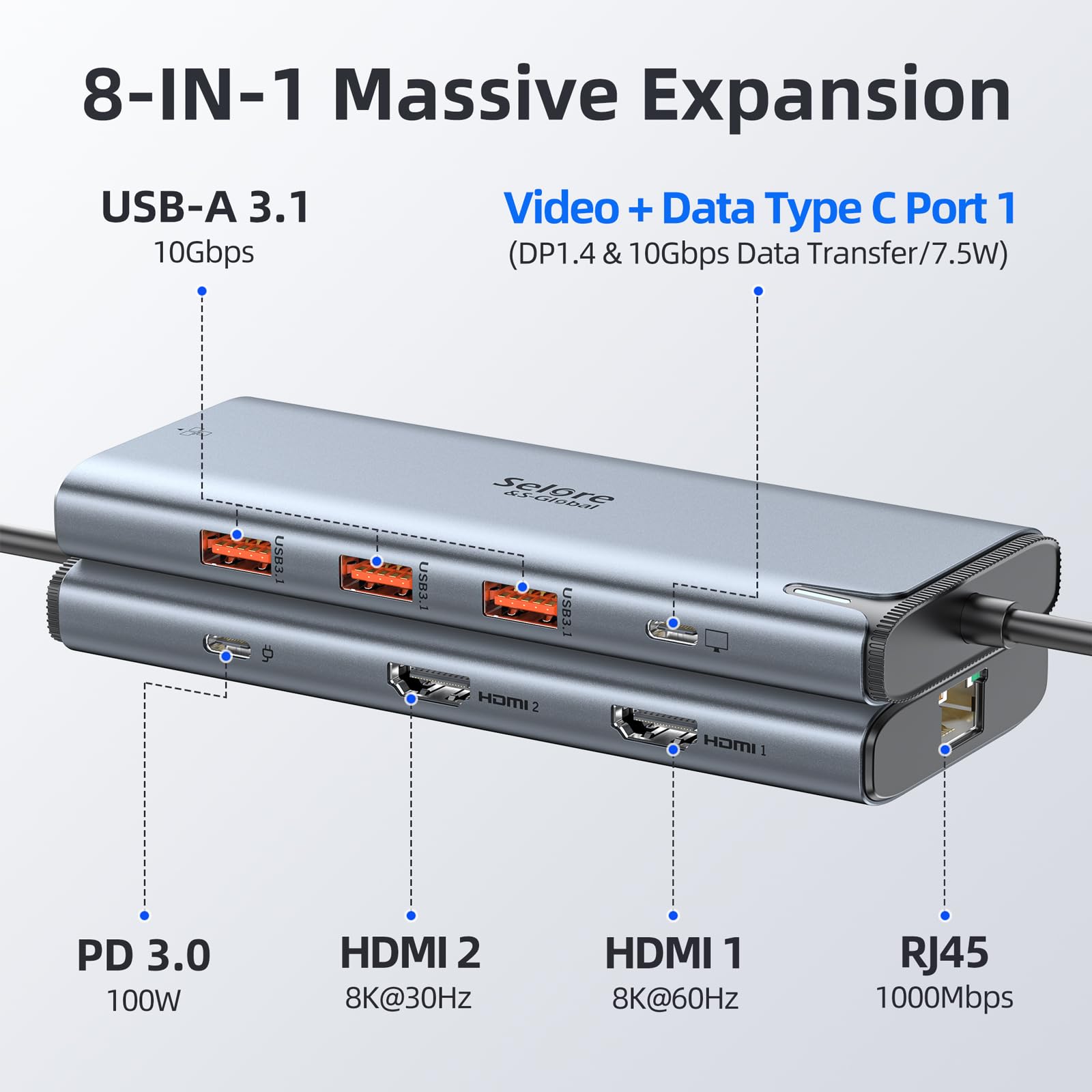 【Intel JHL8140 Multiport USB C HUB 】 USB C Video Docking Station equipped Intel JHL8140 Chip,a USB C video out port has three functions:8K@60Hz video output + 10Gbps data transfer + 7.5W charging.So it's not as bulky as other products and can be easier and faster for you to use (For laptops equipped with a USB-C port and supporting Thunderbolt 3/4 or USB4,and the monitor must support USB C Alt mode)