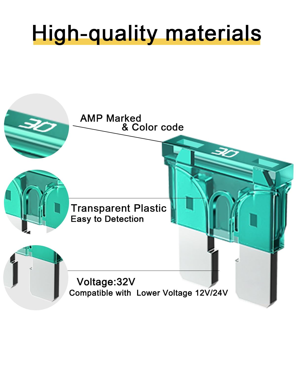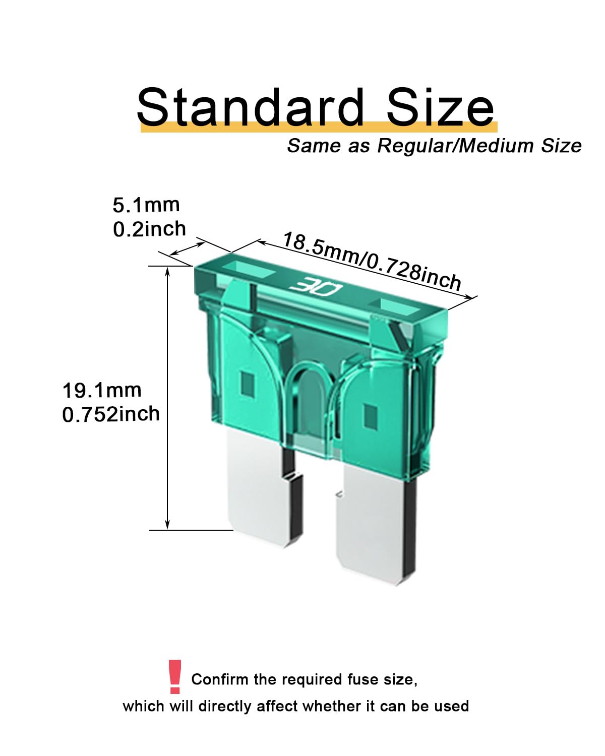 Product Details & Tips - Voltage:32V, Current: 30A, Size: Standard/Regular (This fuse can compatible with lower voltage 12V/24V, but the CURRENT and SIZE must be accurate, Check your desired size and current, which determines whether it can work.)