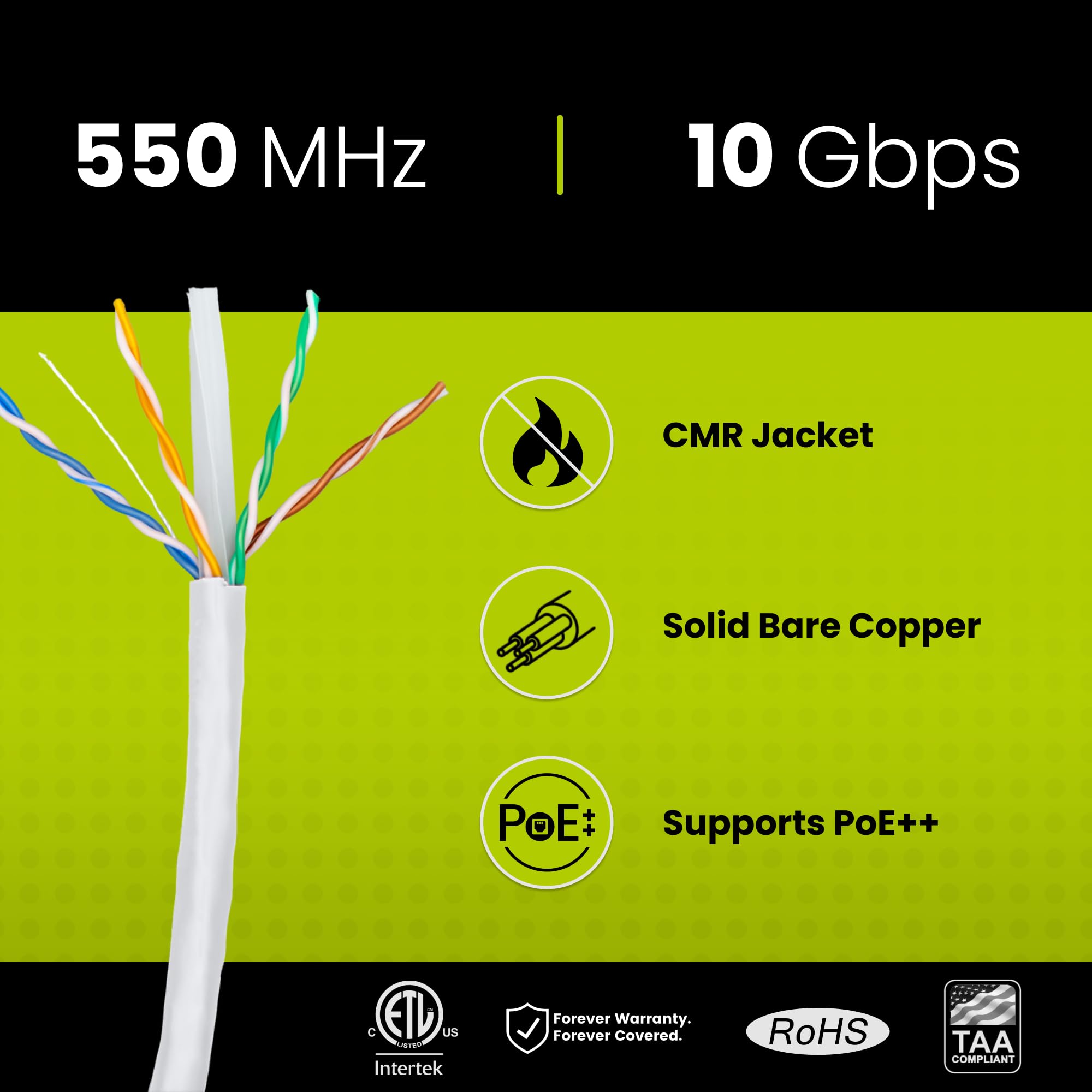 [High Performance Network Cable] This riser rated cat 6 lan cable is 23 AWG with 4 pairs (8 conductors). Suitable for 1 and 5 Gigabit speed up to 328 feet and 10 Gigabit speed up to 165ft depending on the installation environment. Bandwidth tested up to 550 MHz. Supports Power over Ethernet: PoE/PoE+/PoE++ (IEEE 802.3af/at/bt) 4PPoE up to 100W.