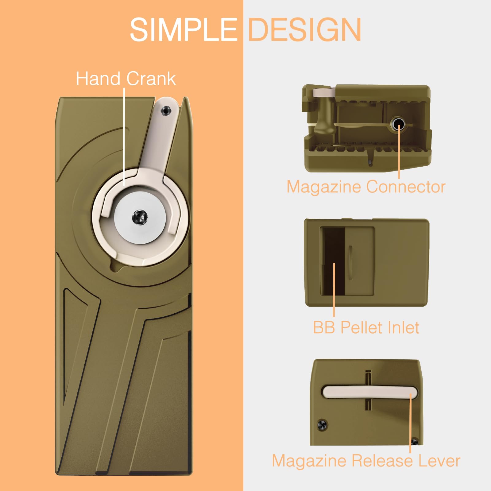 Unique Design: Hand crank design to rapidly load BBs. Magazines lock to prevent magazines from dropping. Built-in O-ring in feeding nozzle keeps BBs from falling out. Tips: If the bolt is too loose or too tight, it may fail to load. In such situation, please use included wrench to adjust the bolt in the middle